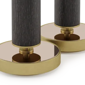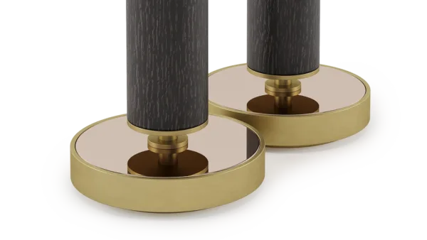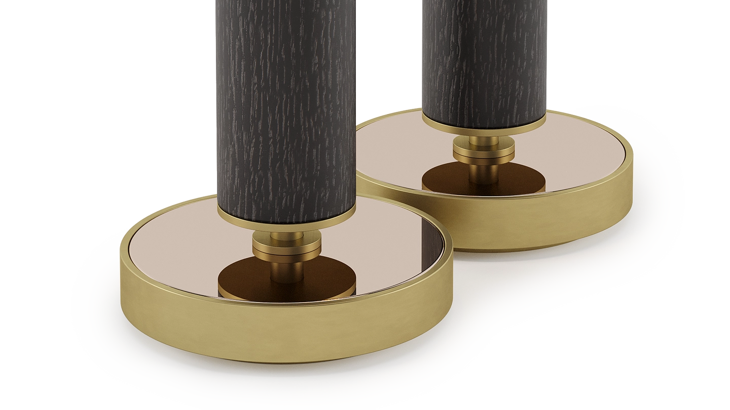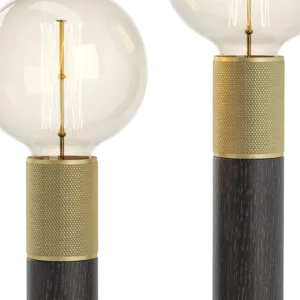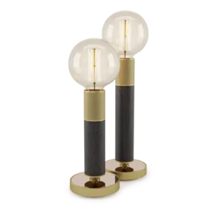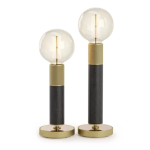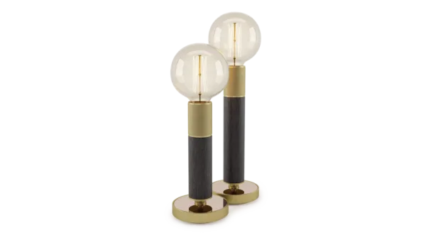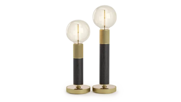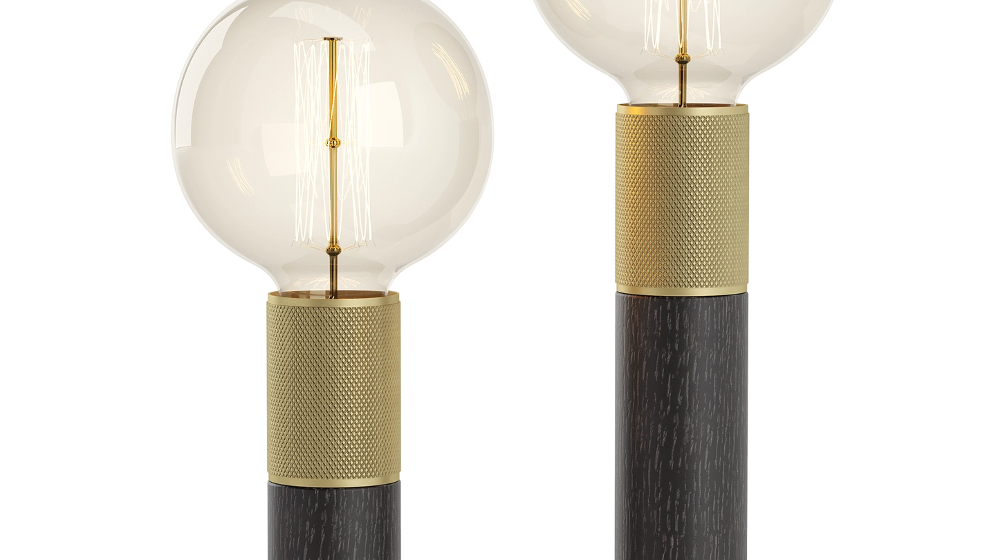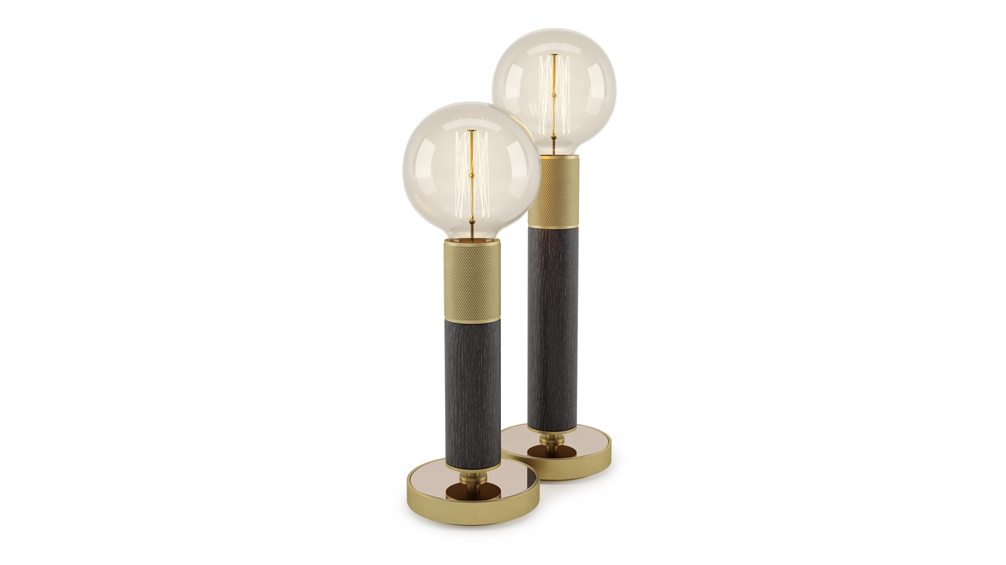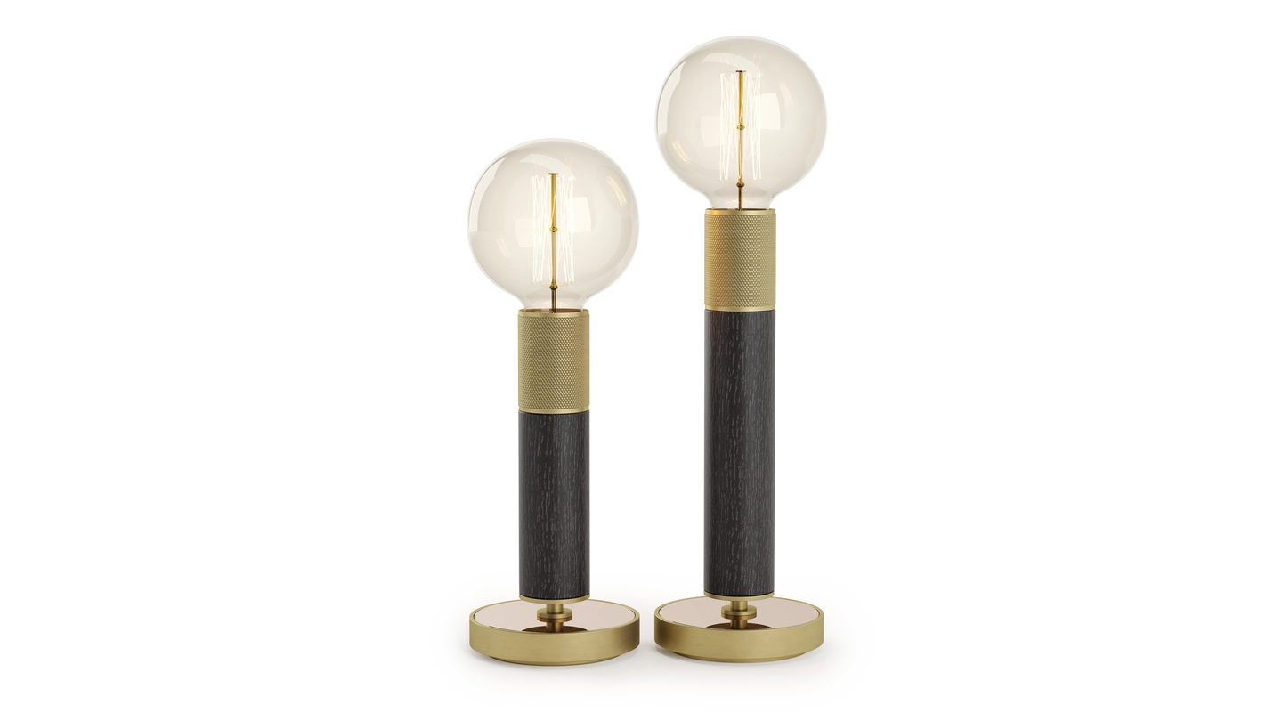 Available in two different sizes, the shade-free ASPEN takes the concept of a table lamp back to basics. Showcasing an incandescent bulb, the core of the design is made from knurled and brushed brass, wood veneer and a base inlay of bronze mirror.