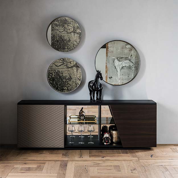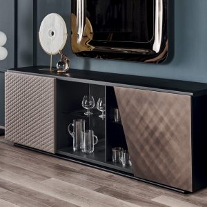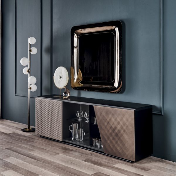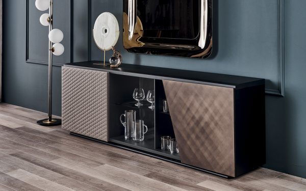 The Cattelan Italia Aston is a stylish two-door sideboard with functional open storage. Featuring a black lacquered wood frame on a matching embossed steel base.