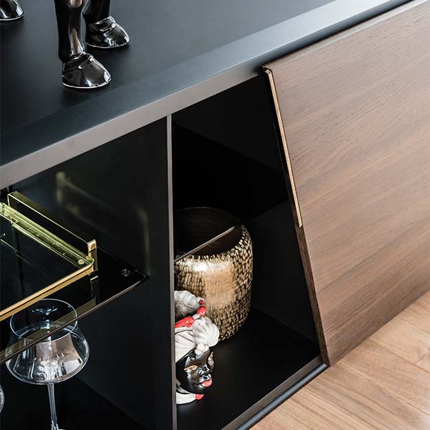 The right-hand door is customisable in a choice of stained or brushed lacquered wood, with black chrome detail, while the left-hand door is available in a range of quilted leather options with embossed titanium aluminium profiles.