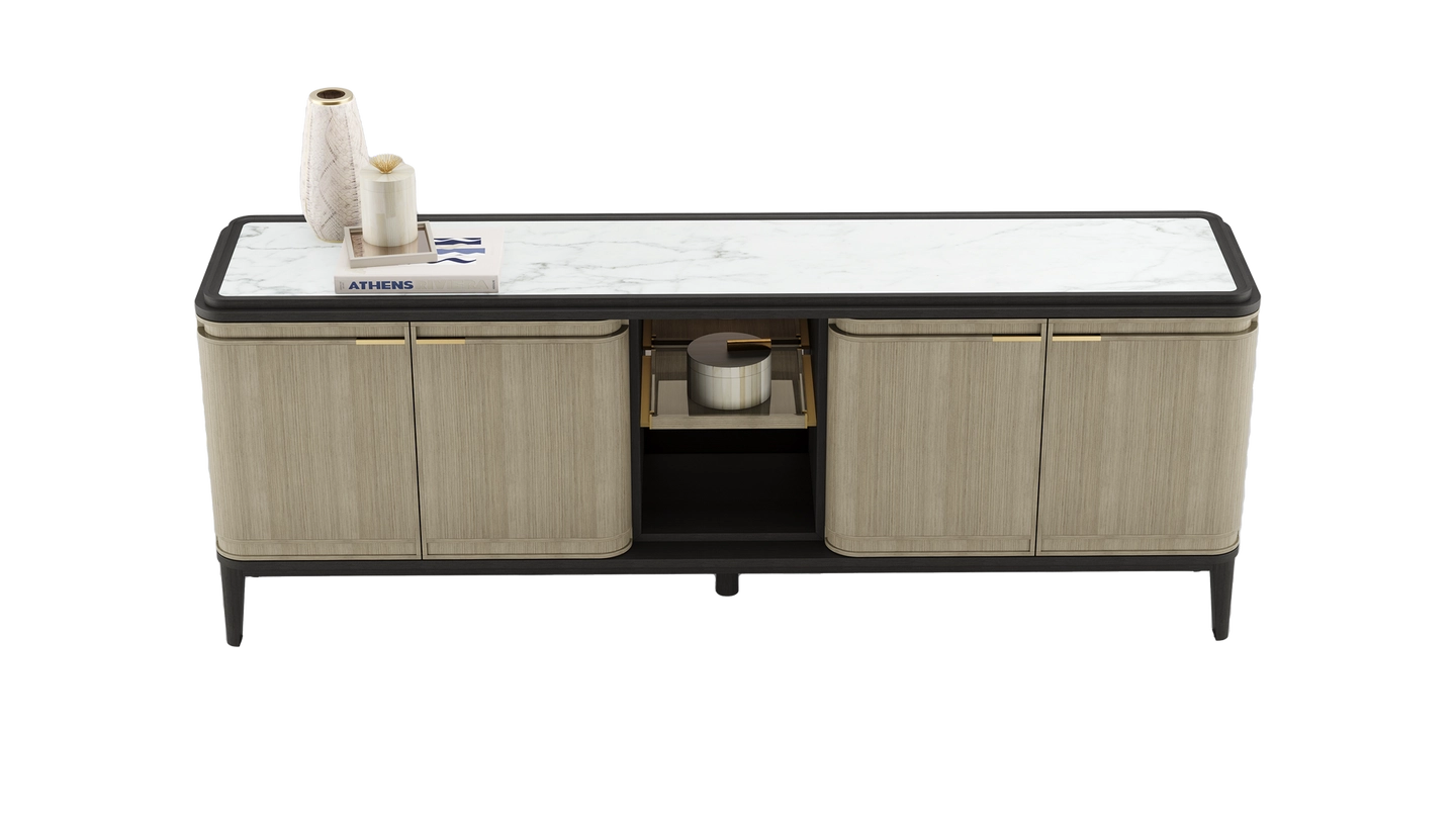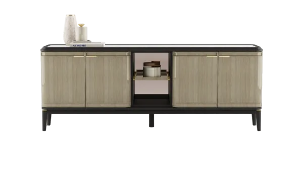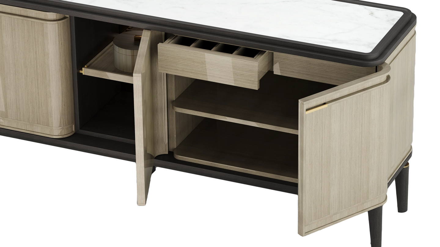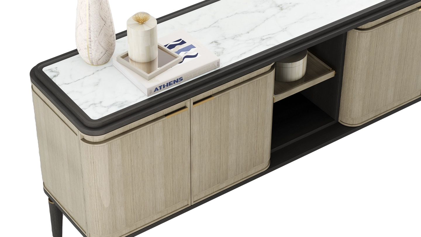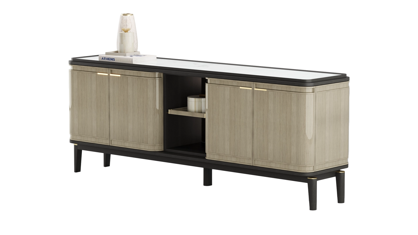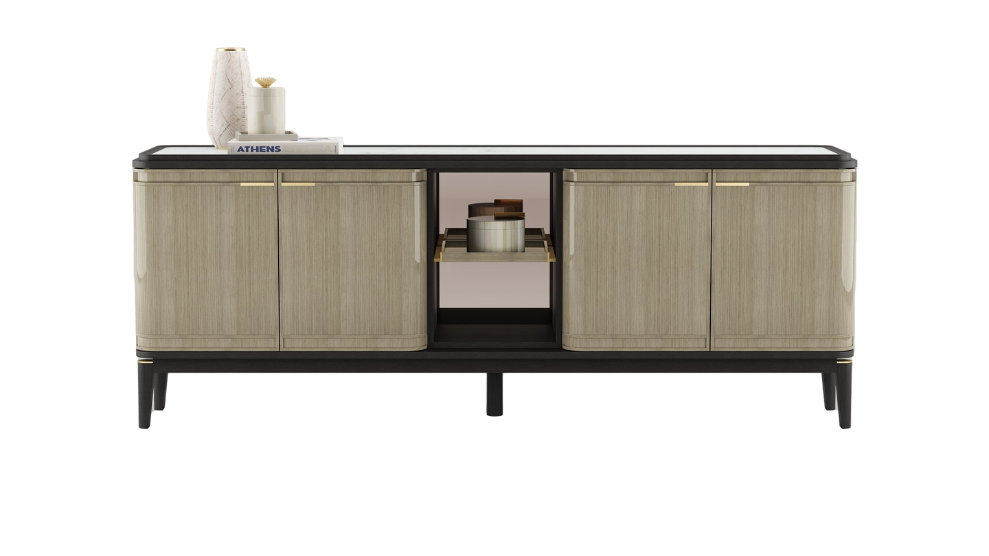 Combining glossy wood, bronze mirror and brushed brass, the AUSTIN Sideboard is every bit as eclectic as the city. Soft curves give it an elegant finish, while a stone inlay adds a modern touch.