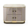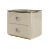 The cube-shaped AVIGNON Bedside Table incorporates two suede-lined drawers, both finished in leather and with inset handles crafted from brushed brass. To the top and bottom, sections of dark wood veneer accented with metallic concludes the design.