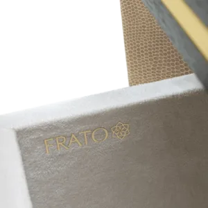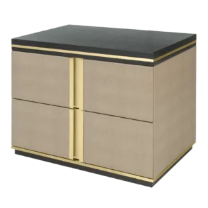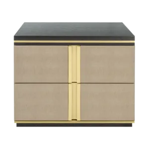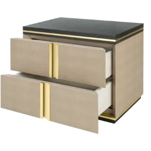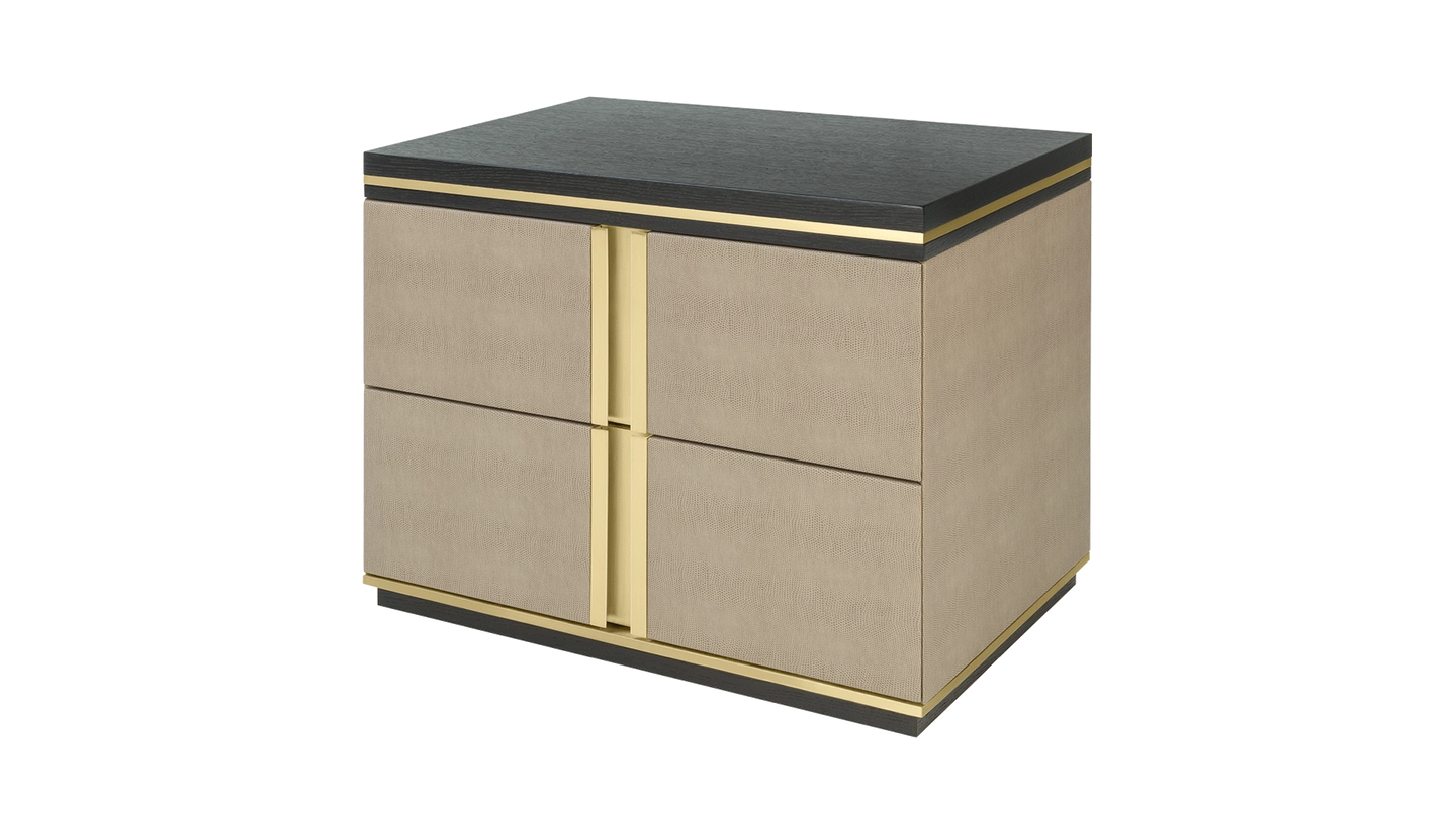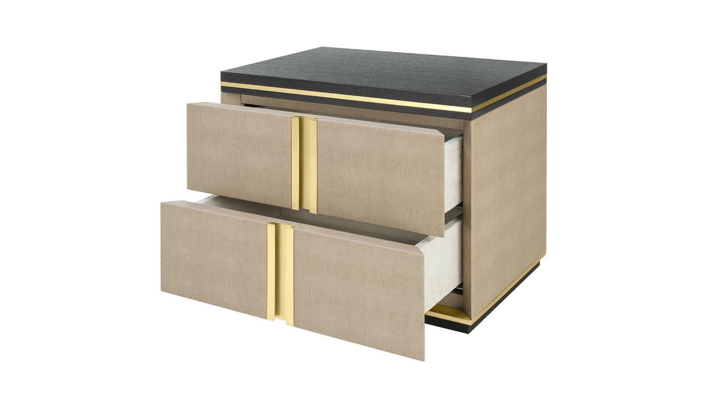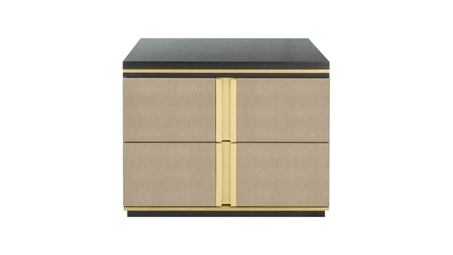 The cube-shaped AVIGNON Bedside Table incorporates two suede-lined drawers, both finished in leather and with inset handles crafted from brushed brass. To the top and bottom, sections of dark wood veneer accented with metallic concludes the design.