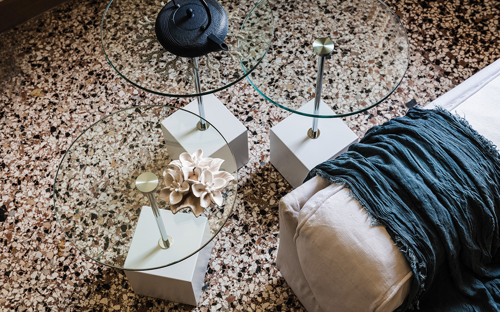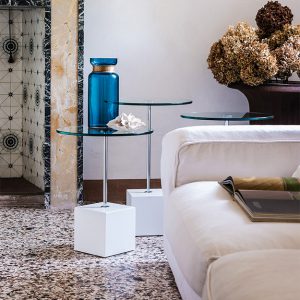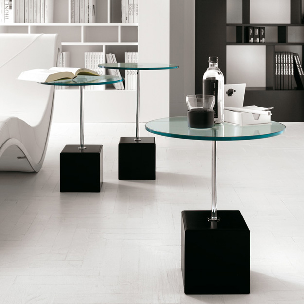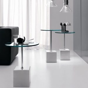 The Axo has a cube-shaped base in White or Black Lacquered Steel supporting a Chrome Stem and a round table top in Transparent Clear Glass.