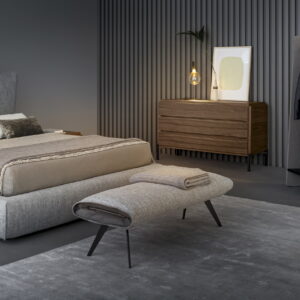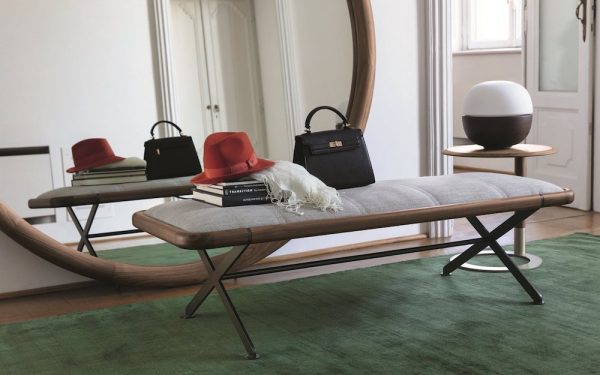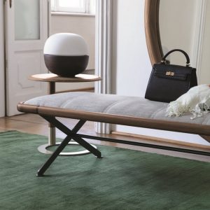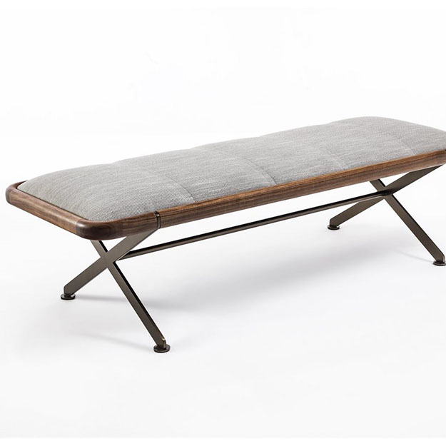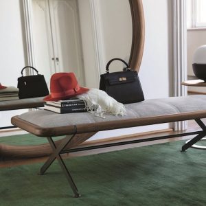 The Porada Axxia is a contemporary bench design featuring ‘X’ detail metal legs supporting a rounded wood seat frame, and an upholstered seat in a range of fabrics or leathers. Available in a selection of natural, stained or matt lacquered Canaletto walnut finishes.