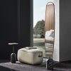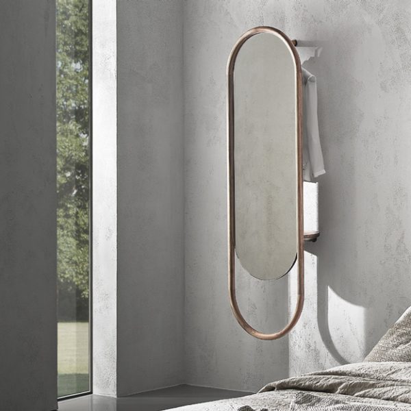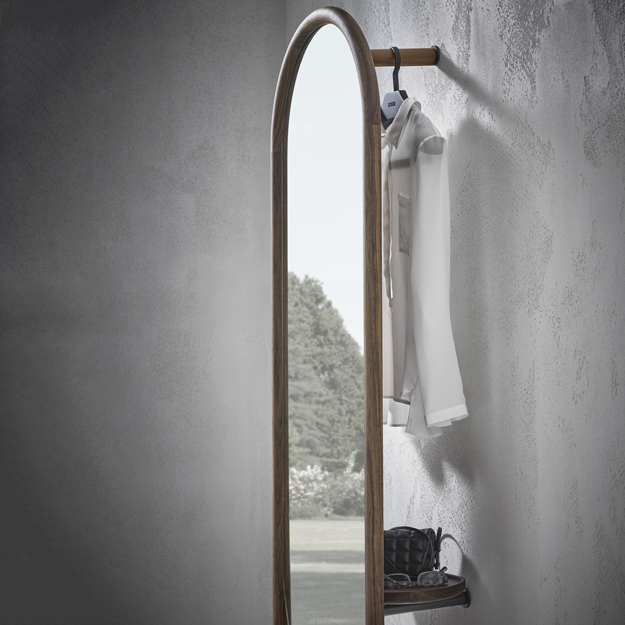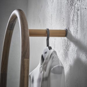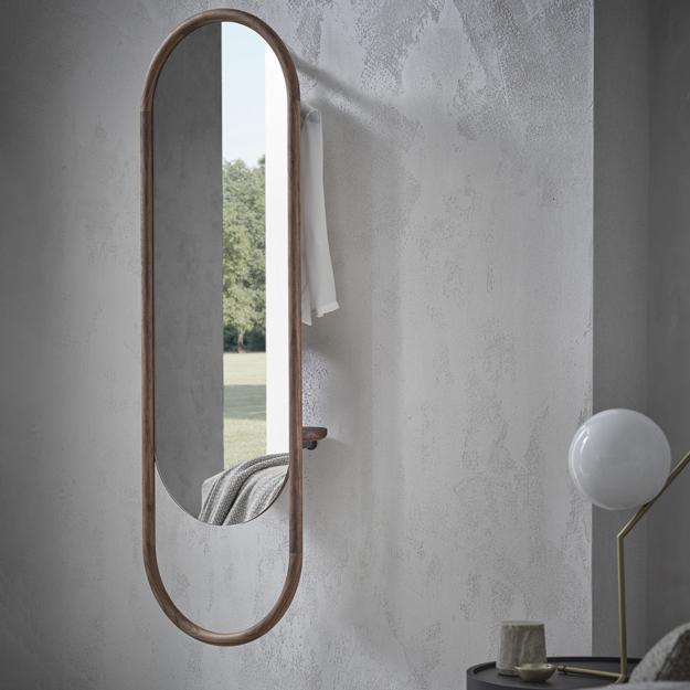 The oval-shaped Backstage mirror by Porada features a solid canaletto walnut frame. The mirror sits out from the wall, creating a gap that allows for a convenient coin tray and a hanging rail finished in Cuoietto hide leather to be hidden from sight, but providing practical space-saving solutions.