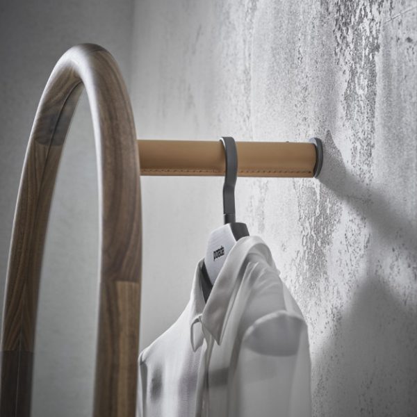 The hanging bar can accommodate up to three clothes hangers. Up to three wenge-stained solid wood hangers are available to order as an additional extra, with or without trouser-and-skirt clips.