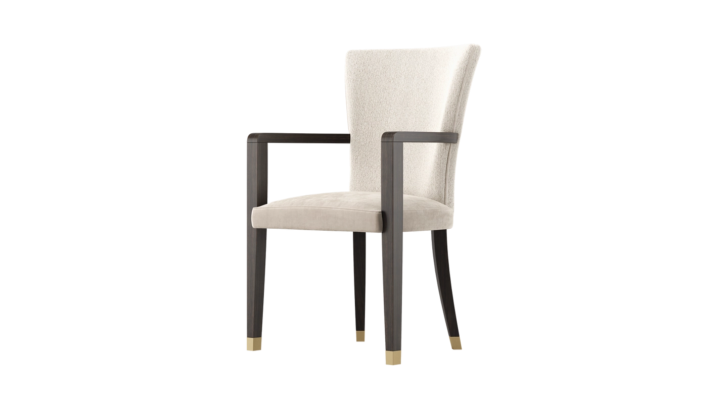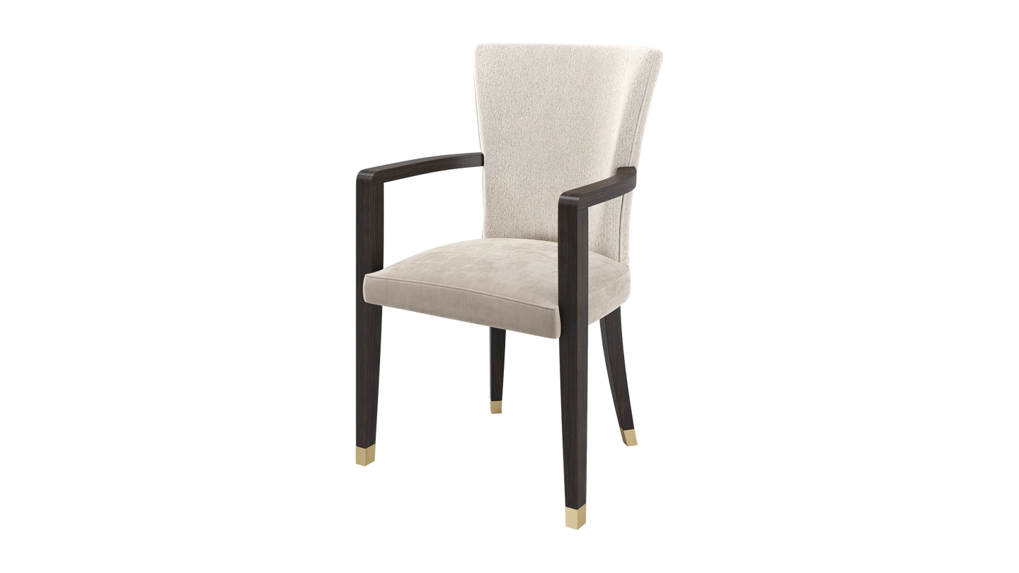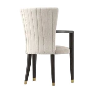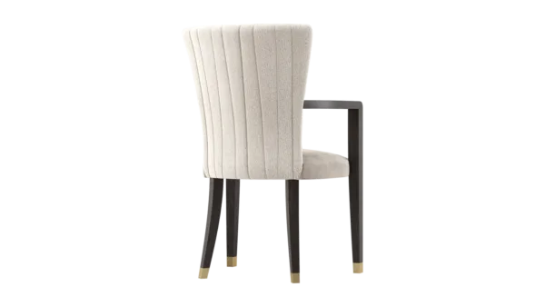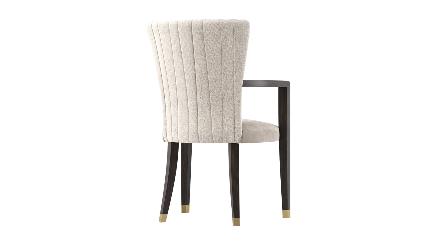 “Pared-back and poised, our high-backed BASTILLE dining armchair wins style points by subtly contrasting a smooth velvet seat with a more textured fabric back that’s further enhanced with delicate linear detailing across the rear. ”