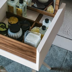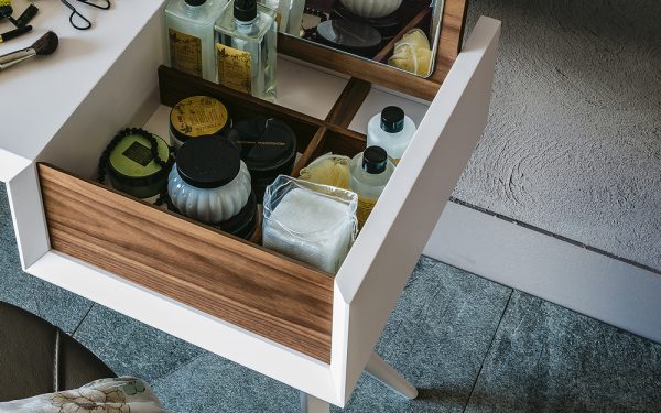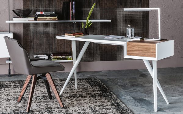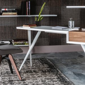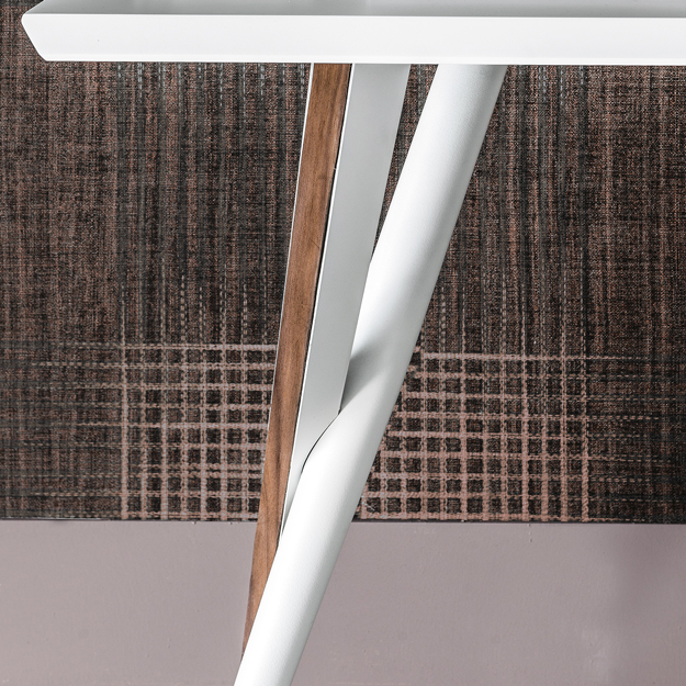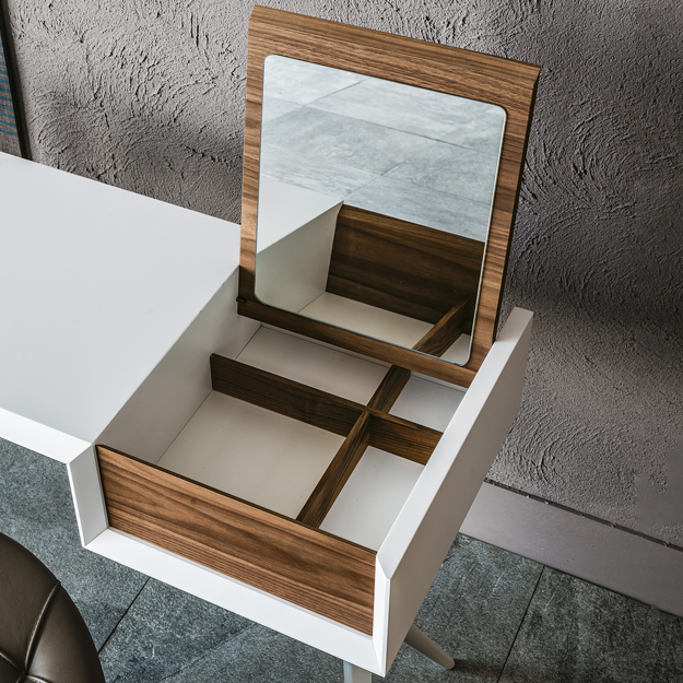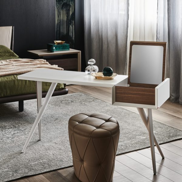 The Batik dressing table features a lacquered wood top with a lift up lid to one side that reveals a sectioned storage compartment and mirror. Two steel legs to each end are poised in an eye-catching crossed formation and finished with a ‘cutaway’ wood detail. The table can be selected in a choice of lacquered colour, contrasted with canaletto walnut wood for the leg detail, storage compartment front and interior.