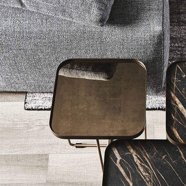The table top features a thin lip round the edge and comes in a Mirrored Bronze Glass finish, which is complemented with a lacquered steel frame with sleigh-style legs.