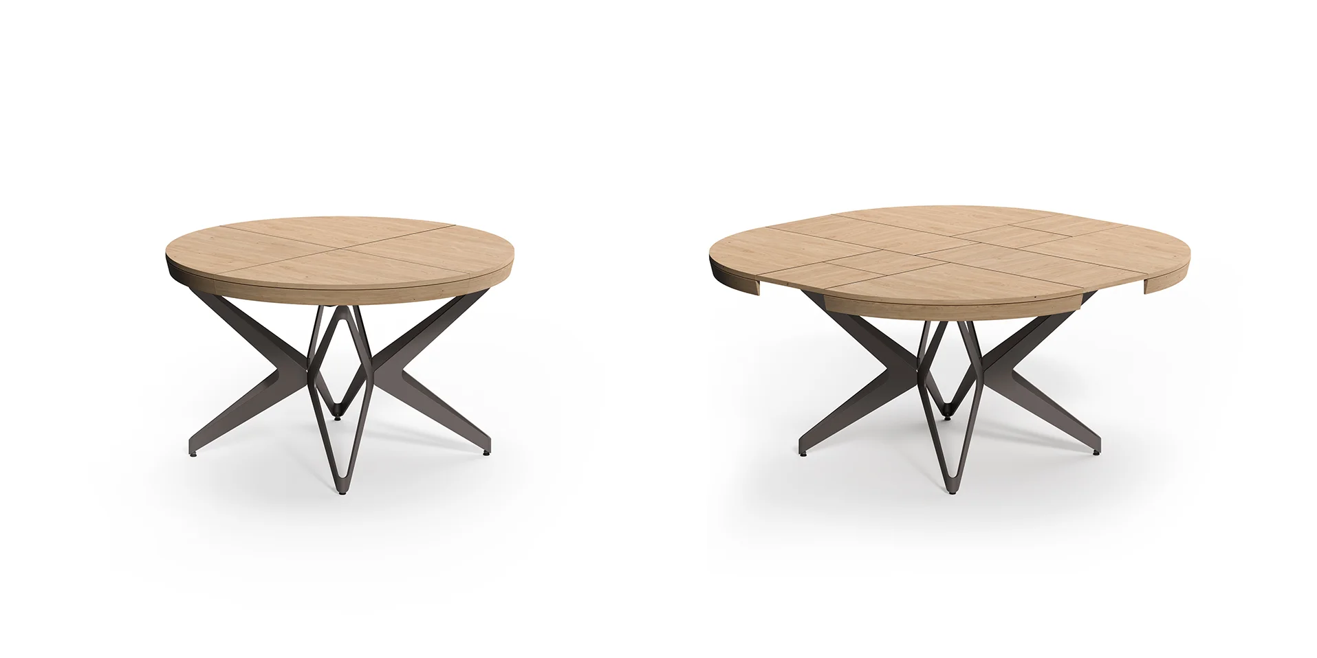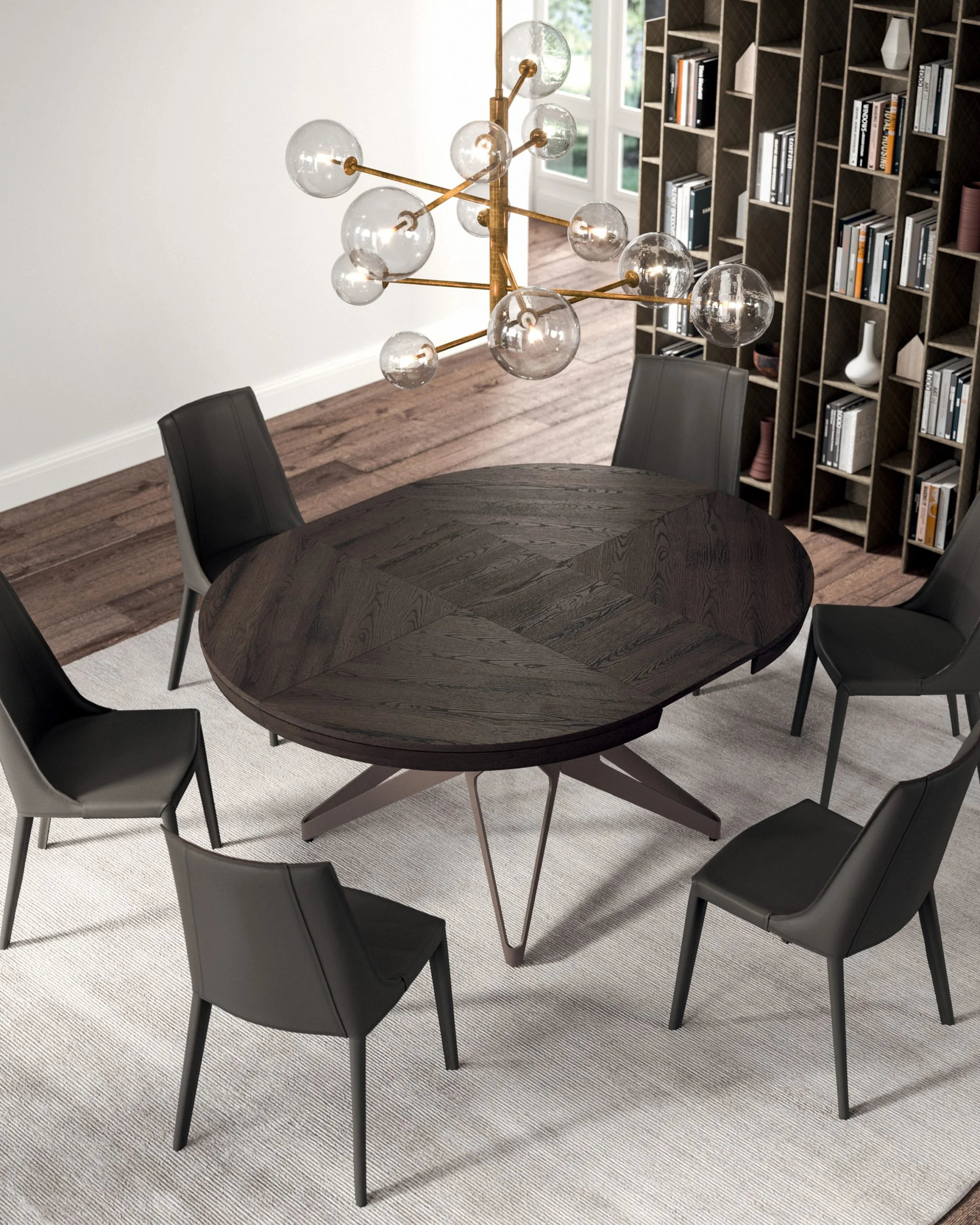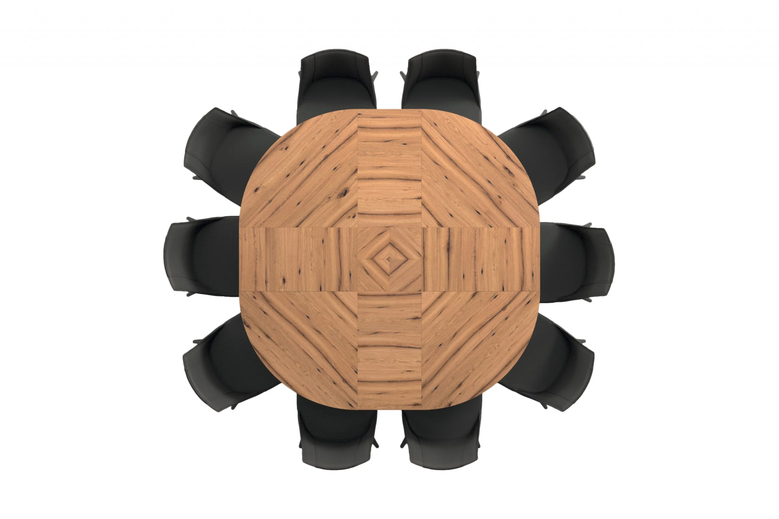 The Big Round extending table represents the evolution and innovation of the round table mechanism. The patented opening mechanism is made up of a perfect overlapping of solidly held joints. The sophisticated design of the legs gives the product strength and personality. Particular attention is paid to the natural old oak finish enhanced by the central inlay that is only visible when the table is fully open.