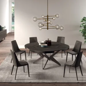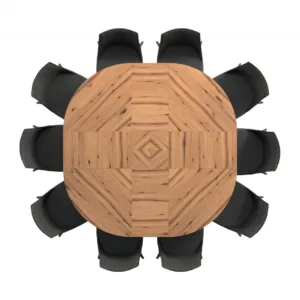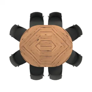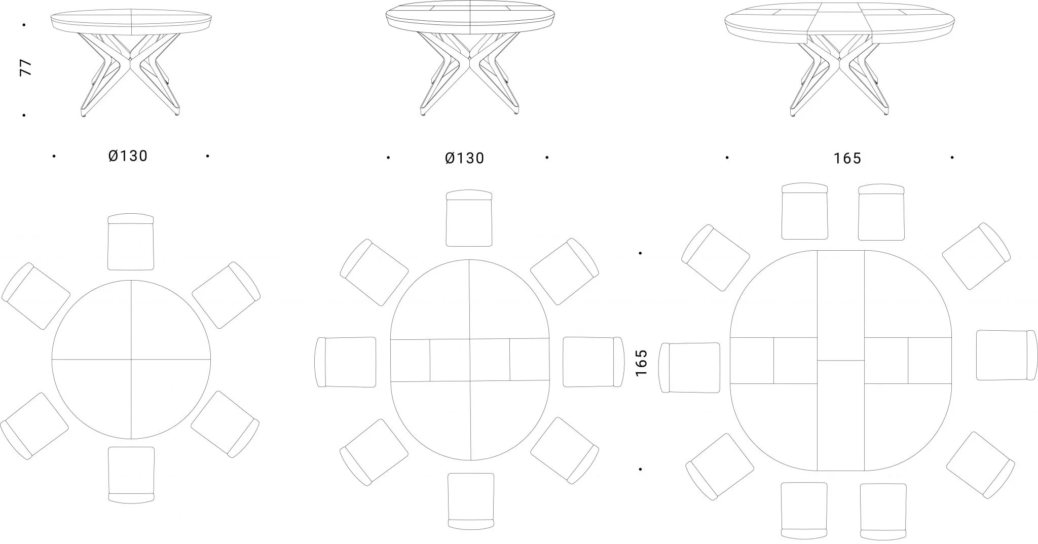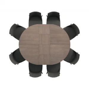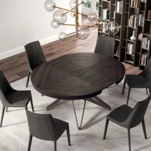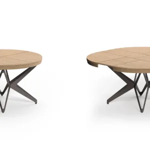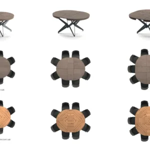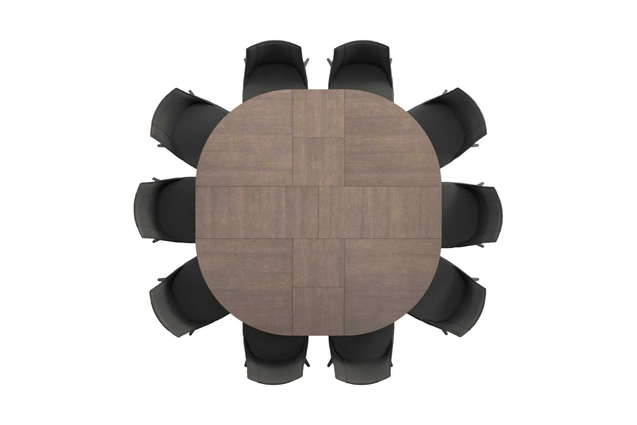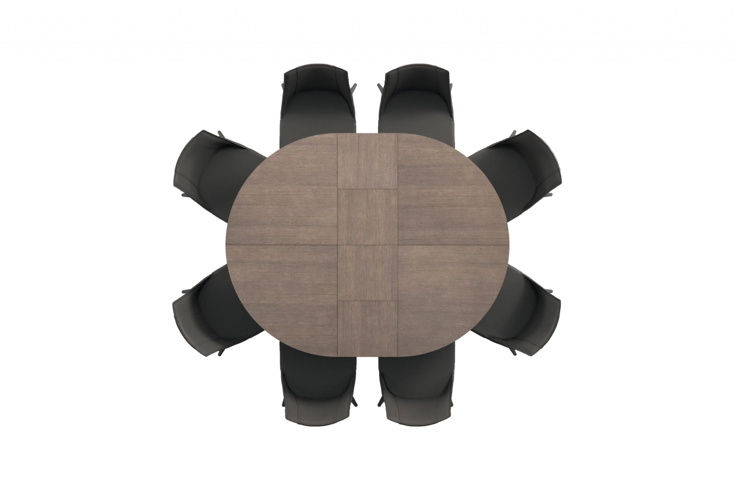 The Big Round extending table represents the evolution and innovation of the round table mechanism. The patented opening mechanism is made up of a perfect overlapping of solidly held joints. The sophisticated design of the legs gives the product strength and personality. Particular attention is paid to the natural old oak finish enhanced by the central inlay that is only visible when the table is fully open.
