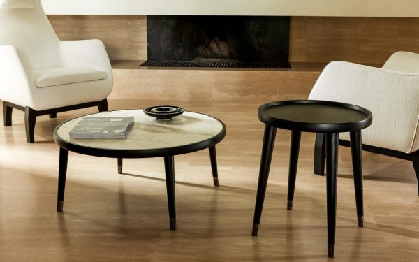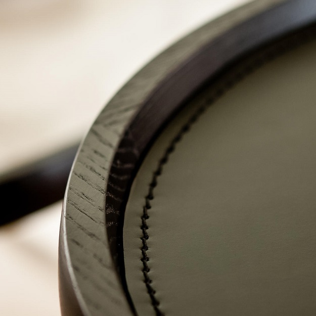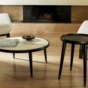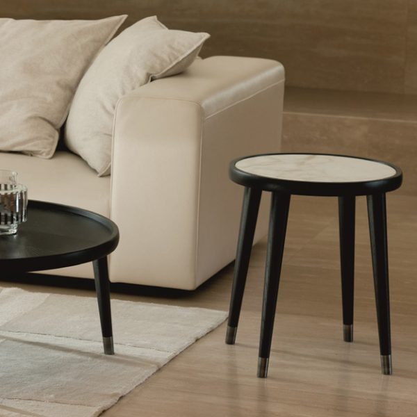 The Bigne is a solid Ash circular side table with the option of a wood, marble or regenerated hide leather top. The table is finished with anthracite brushed metal end feet.