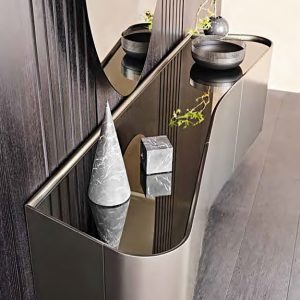 This is complemented by a smoke mirrored glass top and internal clear glass shelves for contrast.