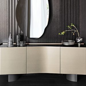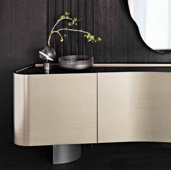 The curvaceous Blues Sideboard by Cattelan Italia is perfectly symmetrical with a stylised rounded shape, recessed in the centre. Finished in Titanium lacquered wood with graphite lacquered steel feet, the external doors, when opened, create a wing-like appearance.