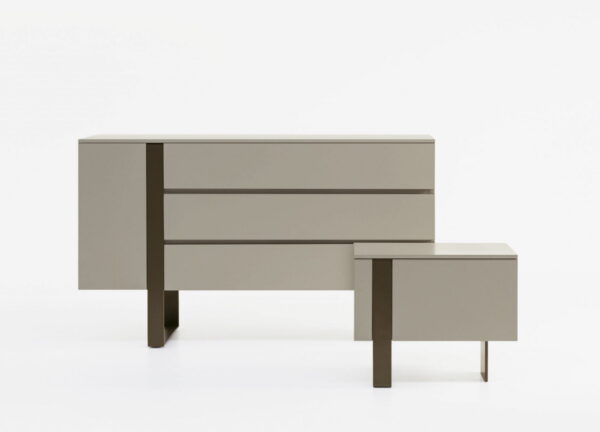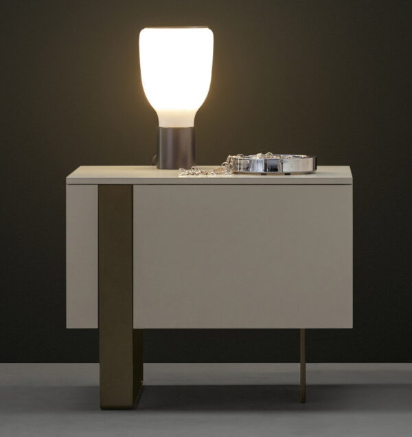 The asymmetrical metal base supporting the lacquered wood structure adds a distinctive original and modern touch. On one side of the element the base runs vertically along the entire front section of the bedside table until it touches the ground; on the other side, it becomes slender and thin, as though wishing to disappear from view.