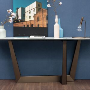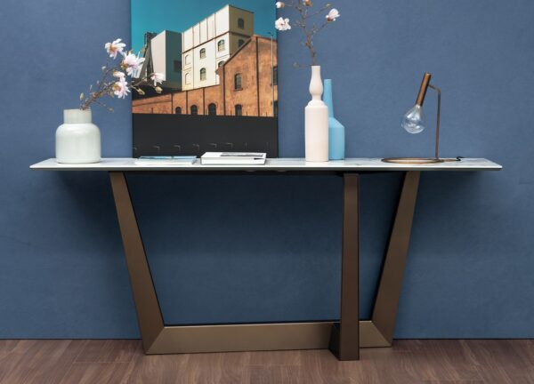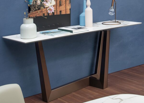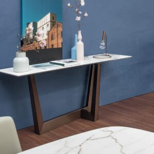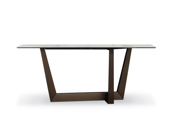 This is the Art console table with a rectangular table top which is shown here with a Calacatta macchia vecchia silk finish ceramic table top and a bronze base.