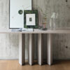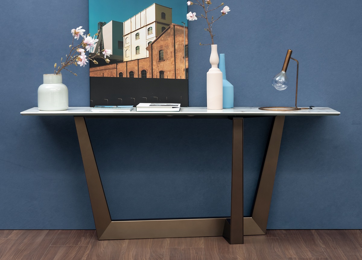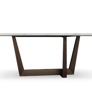 Part of the Art collection of consoles and dining tables all of which feature a metal trapezium that develops diagonally under the table top, allowing minimum obstruction and optimising the space. Slightly rotated in terms of the piece’s main axis, the third support element offers the frame a transversal reinforcement and gives a dynamic perceptive effect.