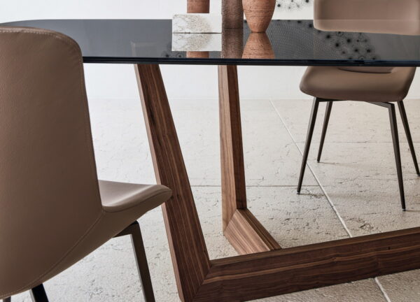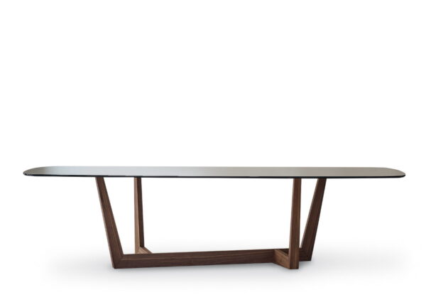 The solid American walnut trapezium base is angled diagonally under the table top, allowing minimum obstruction and optimising the space. To ensure stability, the trapezium is supplemented with two legs which can be customised with inserts in a matching or contrasting finish.