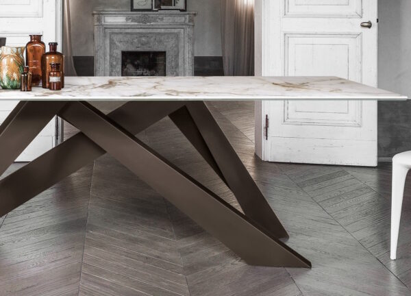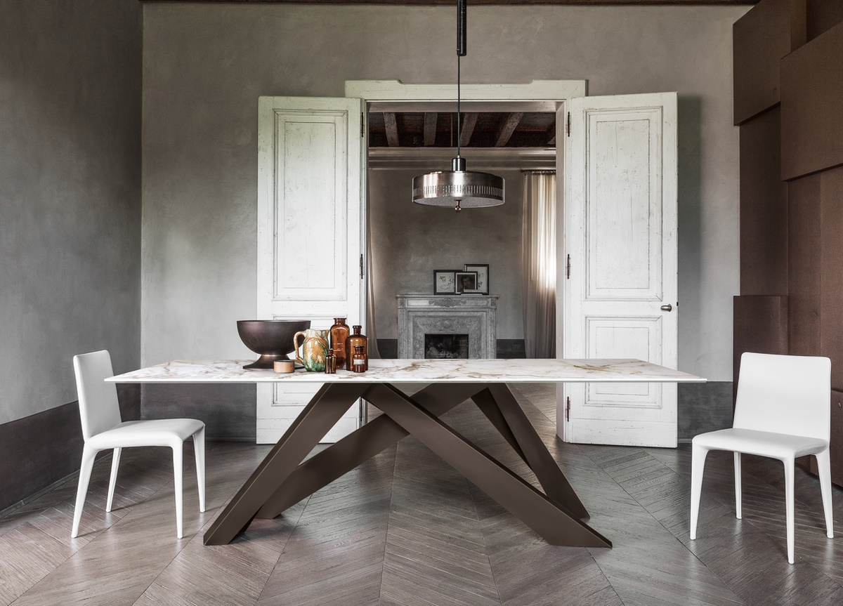 This white version of the Big dining table has a table top in ceramic stone which looks and feels just like marble but is incredibly hard-wearing. There are three finishes to choose from; Iridium white, Calacatta, or Calacatta Macchia Vecchia (shown here) which is only available for the four largest sizes. Please note that the white glass table top is no longer available.