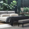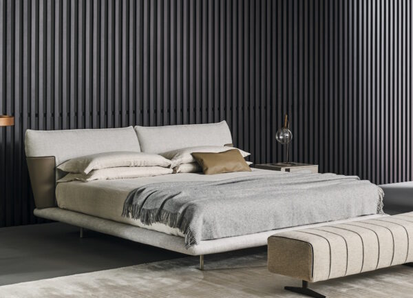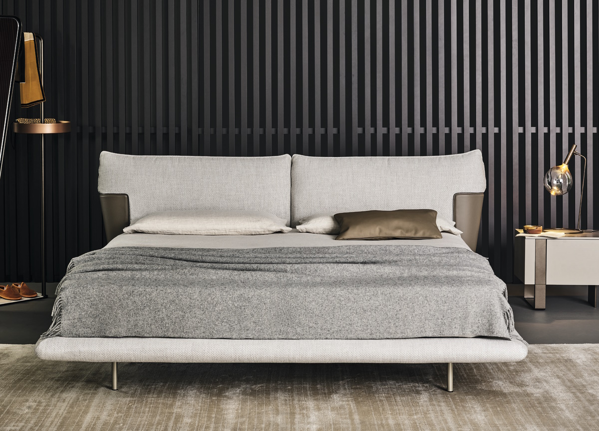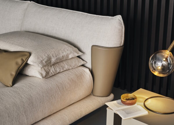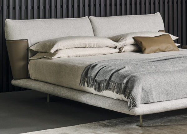 The Bonaldo Blend bed by Giuseppe Viganò combines a deep padded headboard with a wrap-around panel in beautiful emery leather  framing the cushioning.