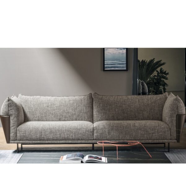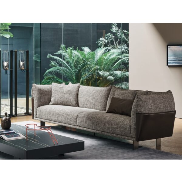 A special feature of this extremely comfortable sofa is the beautiful emery leather which is used to cover the lower structure of the rear of the sofa. This strong, distinctive element can be appreciated from all angles adding softness and framing the cushioning creating a rigorous line that widens upwards from the bottom, merging with a sinuous and welcoming curve that leads back inwards.