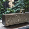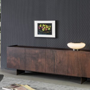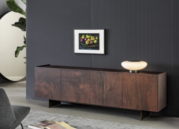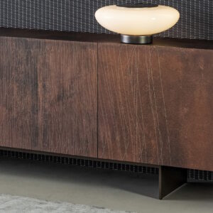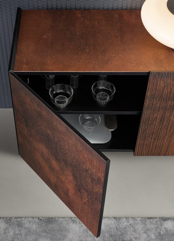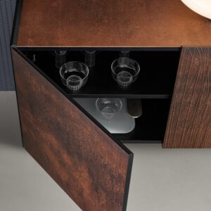 The doors, side and top are digital texture on corten effect wood, whilst the plinth or blade foot base can be selected in either a bronze or lead metal finish. The two internal shelves are in dark grey melamine wood.