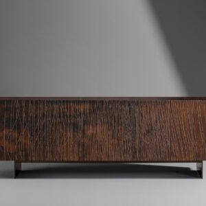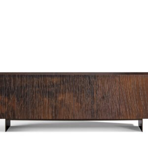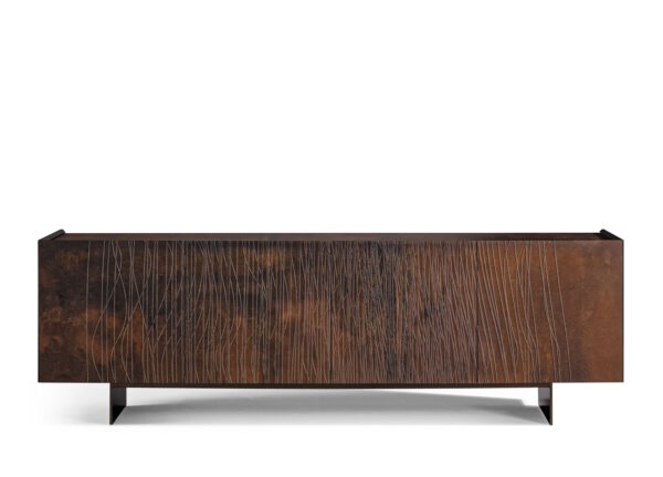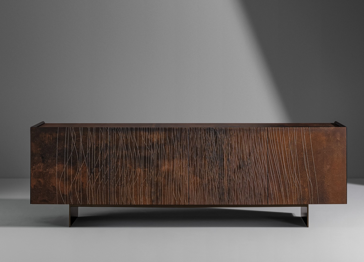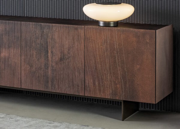 The straight and curved lines of the abstract pattern of the doors, which follow one another in a variable rhythm, both mirror and at the same time emphasize the natural grain of the wood, enhancing the different tonal nuances and the chiaroscuro depths in a perceptive “trick” revealed by its name: blush – as this decoration is a subtle aesthetic tool that causes the sideboard to appear dark red in colour.