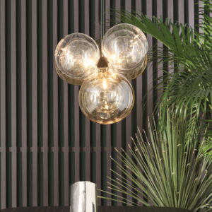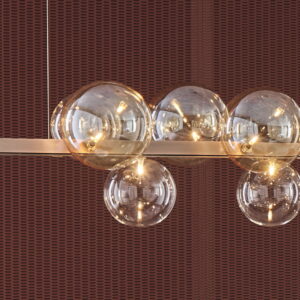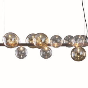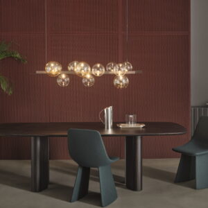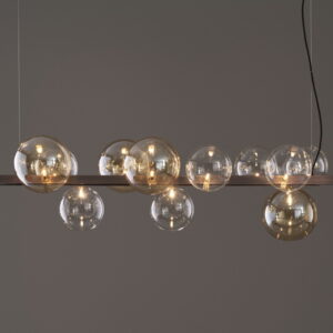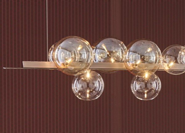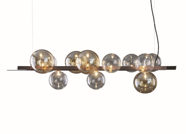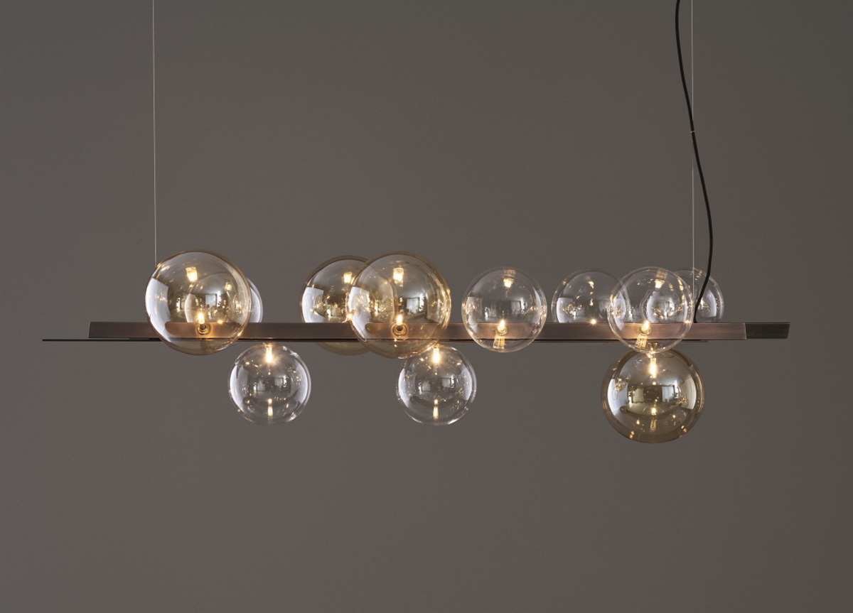 Bon Ton develops around a central axis which comprises of metal blades in either brushed nickel, or copper-bronze. Eleven glass globes, consisting of four large spheres in amber glass and seven in transparent glass are arranged in an irregular order, accentuating their sculptural nature.