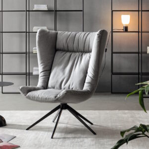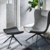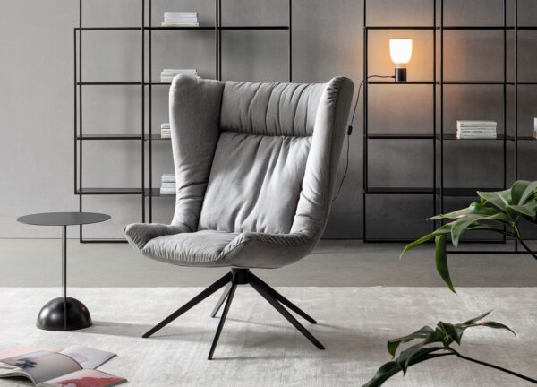 A metal five-spoke swivel base lends itself to the overall image of lightness and motion, recalling the idea of “comfort without gravity” conceived by Fabrice, the designer. This can be chosen in a range of finishes. For the upholstery you can select from a range of different fabric categories.