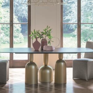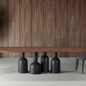 Conviviality, the primary function of any table, is expressed with irony in this design. Innovative and colourful table legs are made from painted steel & are shaped like bottles, or champagne glasses, so that what might be on top of the table, is mirrored below it.