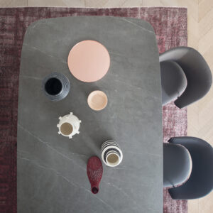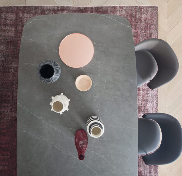 For the table top, which is rectangular with rounded ends, there are a range of options, including oak and walnut, matt or glossy marble or top quality ceramic, which looks and feels just like marble but is incredibly hard-wearing. Not all finishes are available in all sizes.