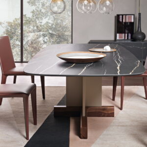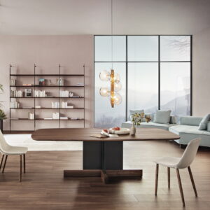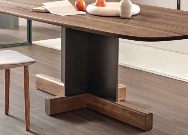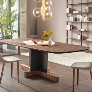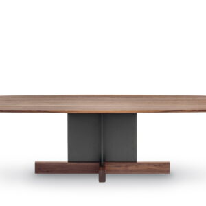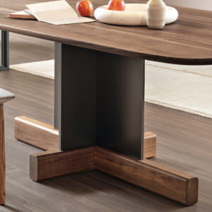 The table top rests only on a thin structure, but it is the wooden base in the shape of a cross that gives the table it’s name, as well as it’s solidity and structural force. The three different and very distinct elements offer the possibility of creating various combinations of finishes and colours, from the most original to the most understated ones, for a highly customisable table.