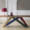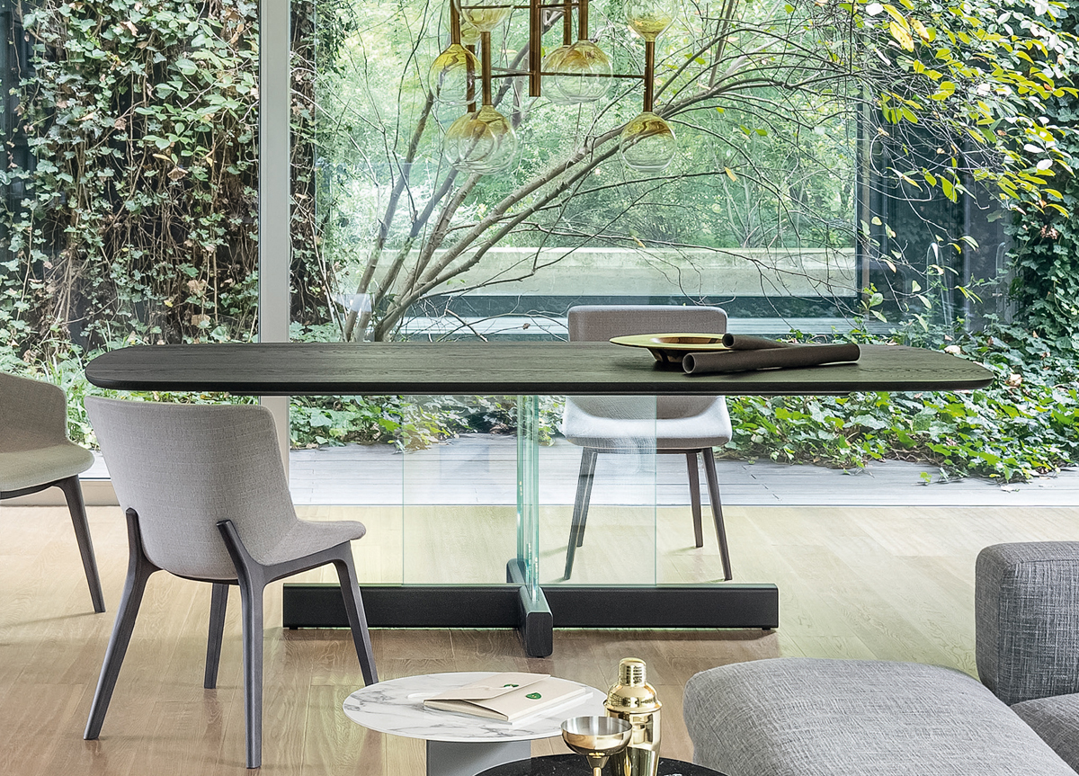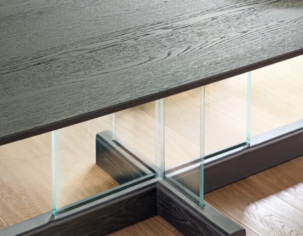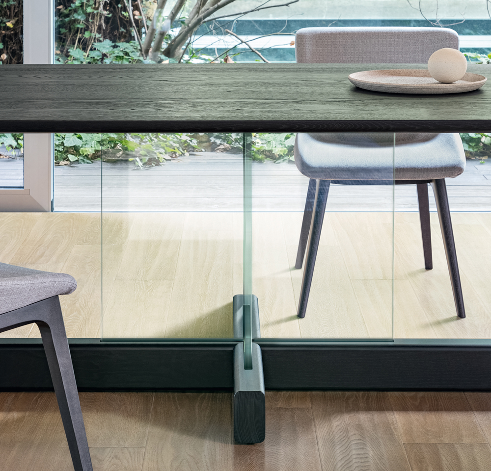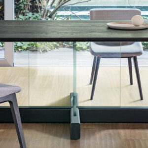 The Cross dining table is a combination of three essential elements: a top, glass structure and base. The table top rests only on a thin structure, but it is the wooden base in the shape of a cross that gives the table it’s name, as well as it’s solidity and structural force. The different and very distinct elements offer the possibility of creating various combinations of finishes and colours, from the most original to the most understated ones, for a highly customisable table.