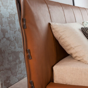 This unique bed also has visible leather inserts on both the headboard and bed frame (see detailed images). The inserts and frog fastenings are available in capri leather only.