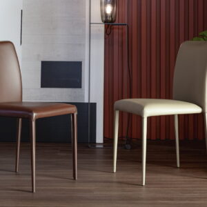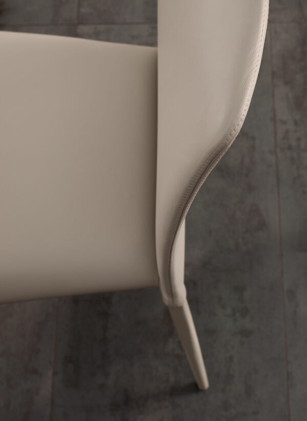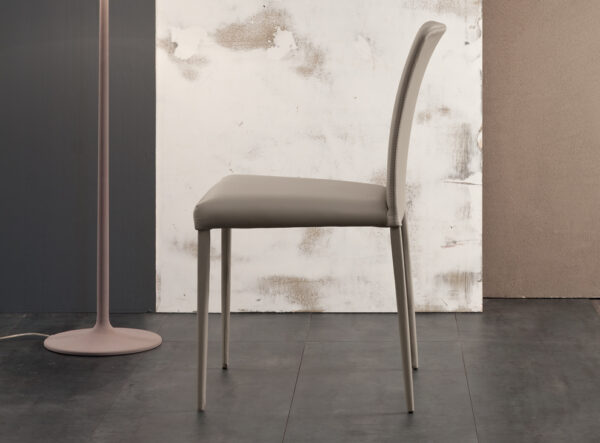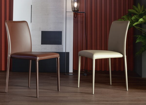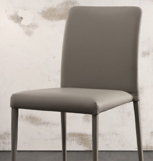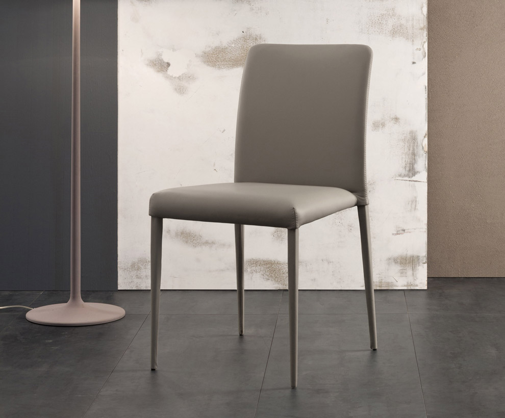 Fully covered (including the legs if you like) the Deli chair has a comfortable padded seat. For the covers choose from ecoleather (a very high quality faux leather that is quite difficult to tell apart from real leather), emery leather (with black stitching and edge) or Capri leather.