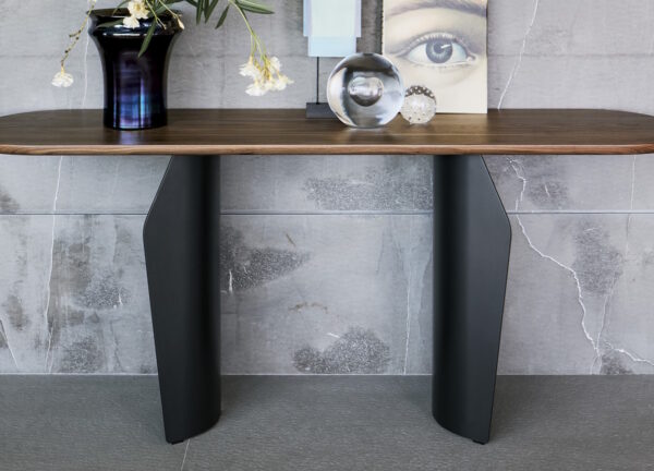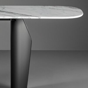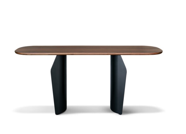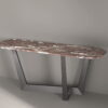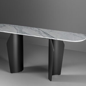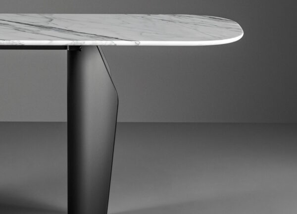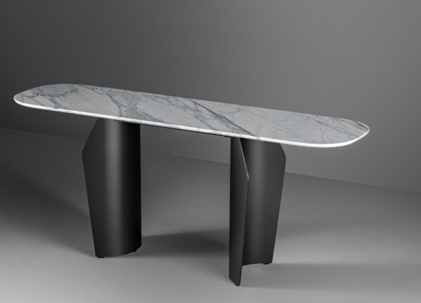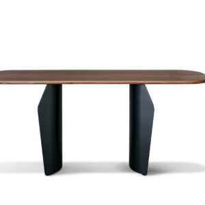 Two flared metal legs support the table top which is available in wood, ceramic or marble, finishes that contrast with the visual and structural solidity of the legs.