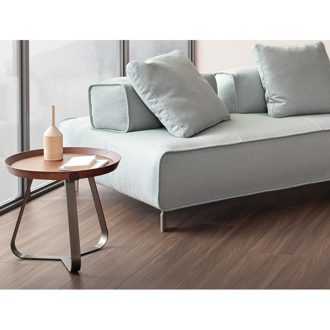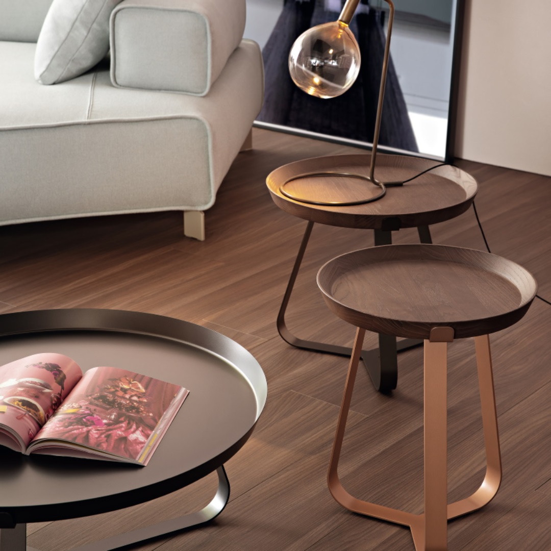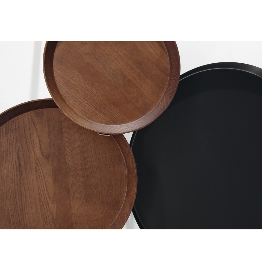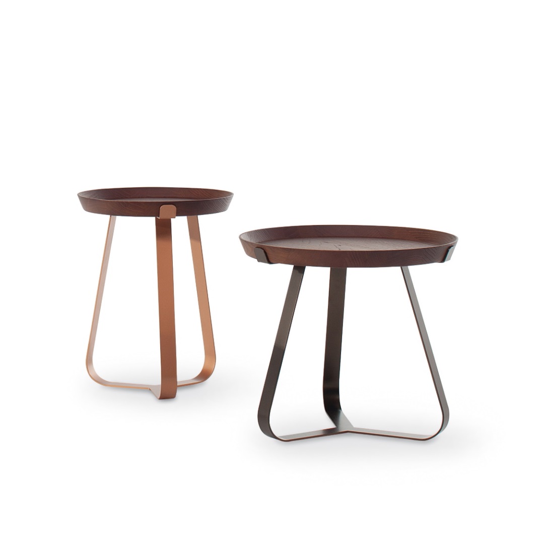The geometric design of the frame makes these tables light-weight, while a game of balances between sharp corners and rounded angles supports a removable tray whih can be selected in either coal ash or walnit painted ash.
