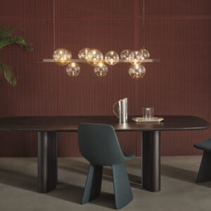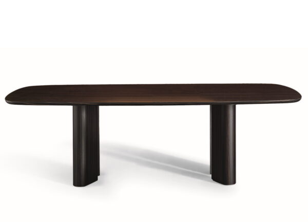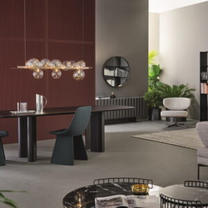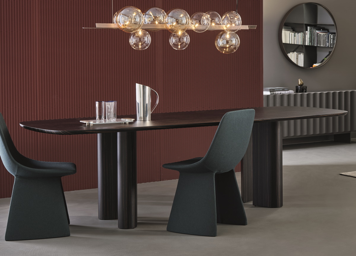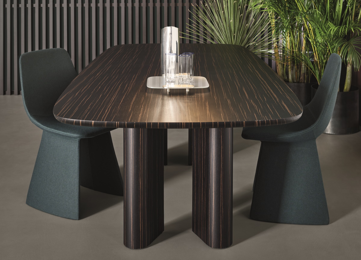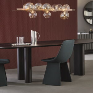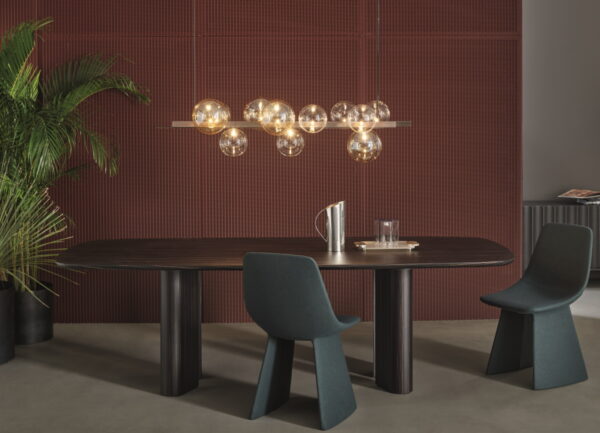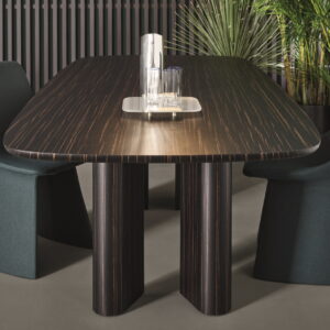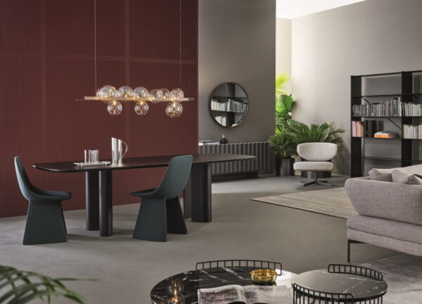Geometric is a table that changes shape depending on the observer’s perspective. The concept is based on chameleon-like silhouettes, starting with the base: it’s four legs with drop-shaped feet appear either thick, or sharp and thin, offering a different perception of their visual weight as you walk around the table. The rounded ends of this rectangular table add a further graceful feel.