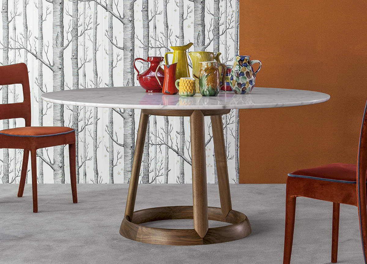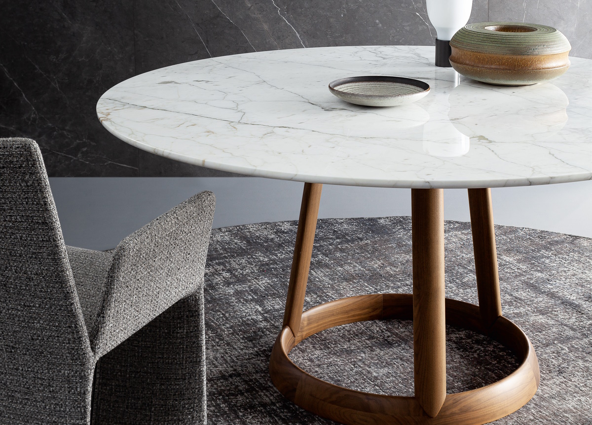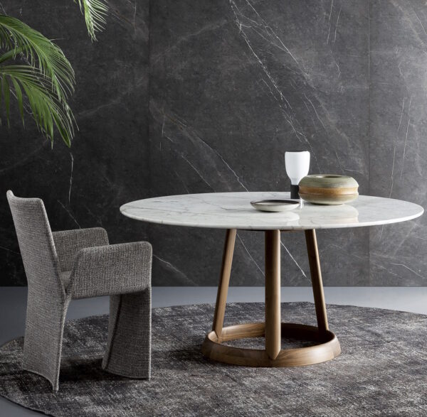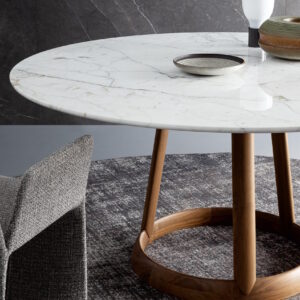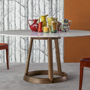 The beautiful Greeny round dining table was designed for Bonaldo by Gino Carollo, who wanted to design a table that would express the well-being derived from nature. The name Greeny was chosen to depict the tables personality and to represent its use of natural materials – solid wood bases and marble tops.