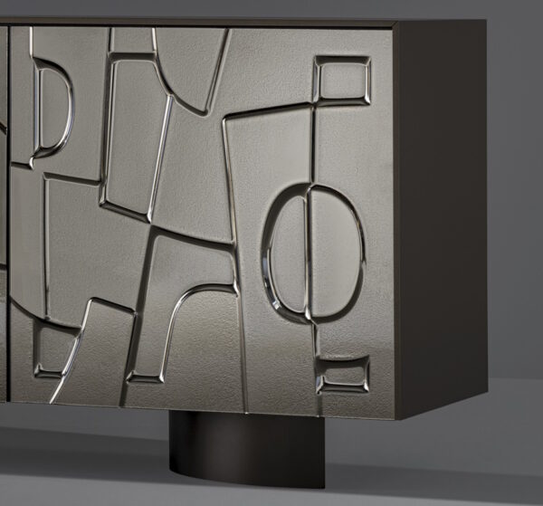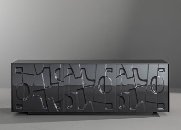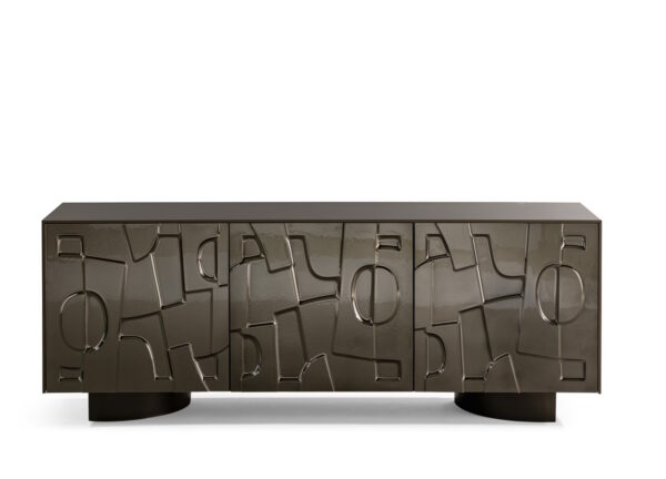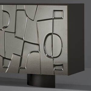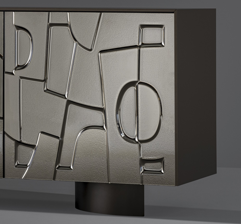 The main characteristics of this striking sideboard are the unusual texture of its moulded glass doors which resemble an idealised bas-relief. The front of the sideboard presents an abstract geometric pattern. As a piece of furniture, it demonstrates the combination of research into decorative qualities with volumetric purity.
