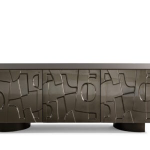 There are two different finish combinations, firstly, you can select a bronze lacquered wood outer frame with metallic mirrored bronze printed glass doors and a bronze metal base, or secondly, you can choose a lead lacquered wood outer frame with metallic mirrored lead printed glass doors and a lead metal base.