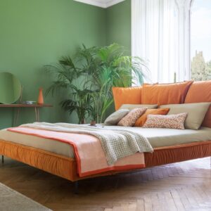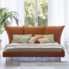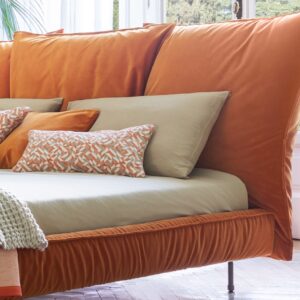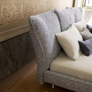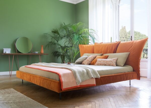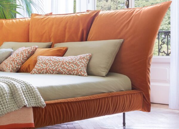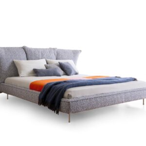 Made in Italy this extremely comfortable bed from Bonaldo features a deep upholstered headboard made of three slightly overlapping large cushions. The sense of softness is further enhanced by the padded bed frame which sits on thin metal feet.