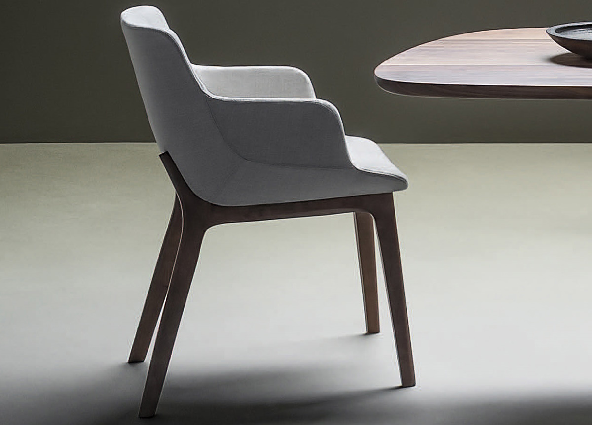 The distinguishing feature of this chair, which is clearly evident from the front, is its backrest and armrests that constitutes a single whole with the seat and opens out at the top, giving the observer the idea of expansion and breadth.