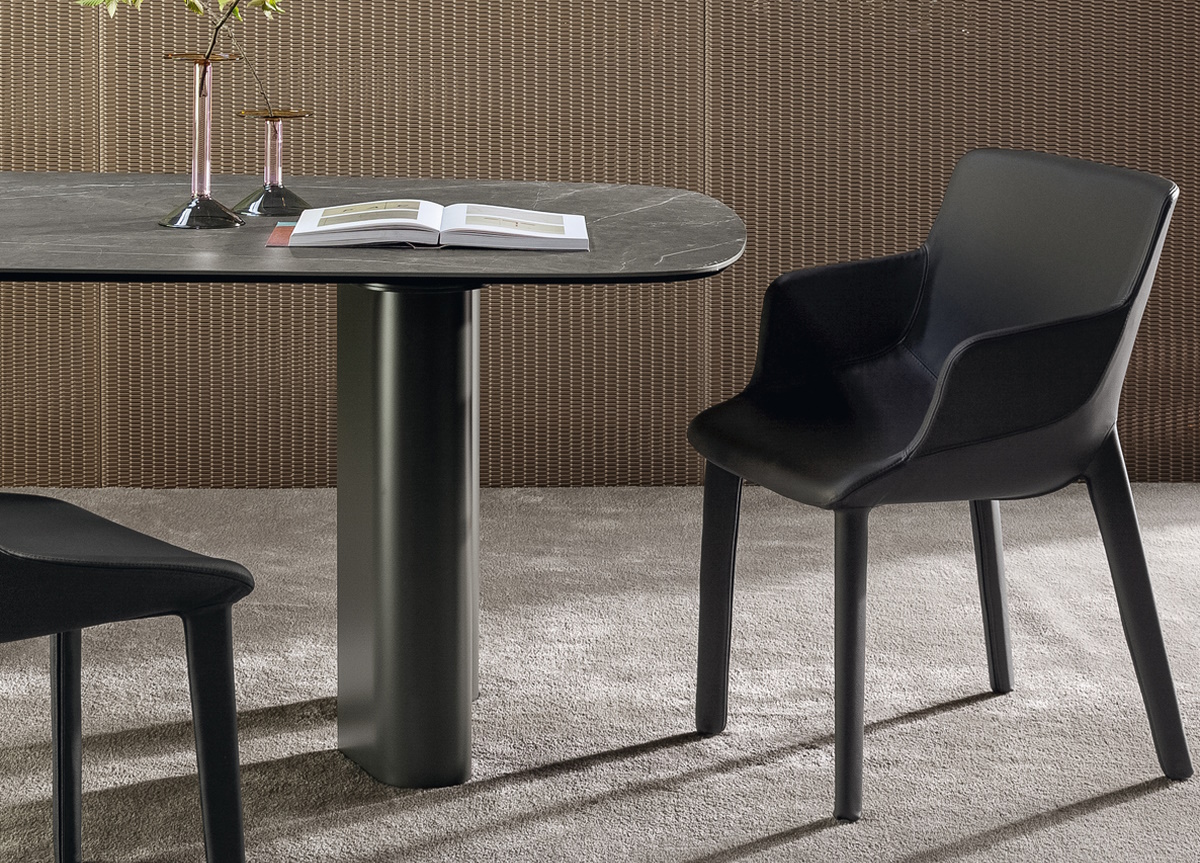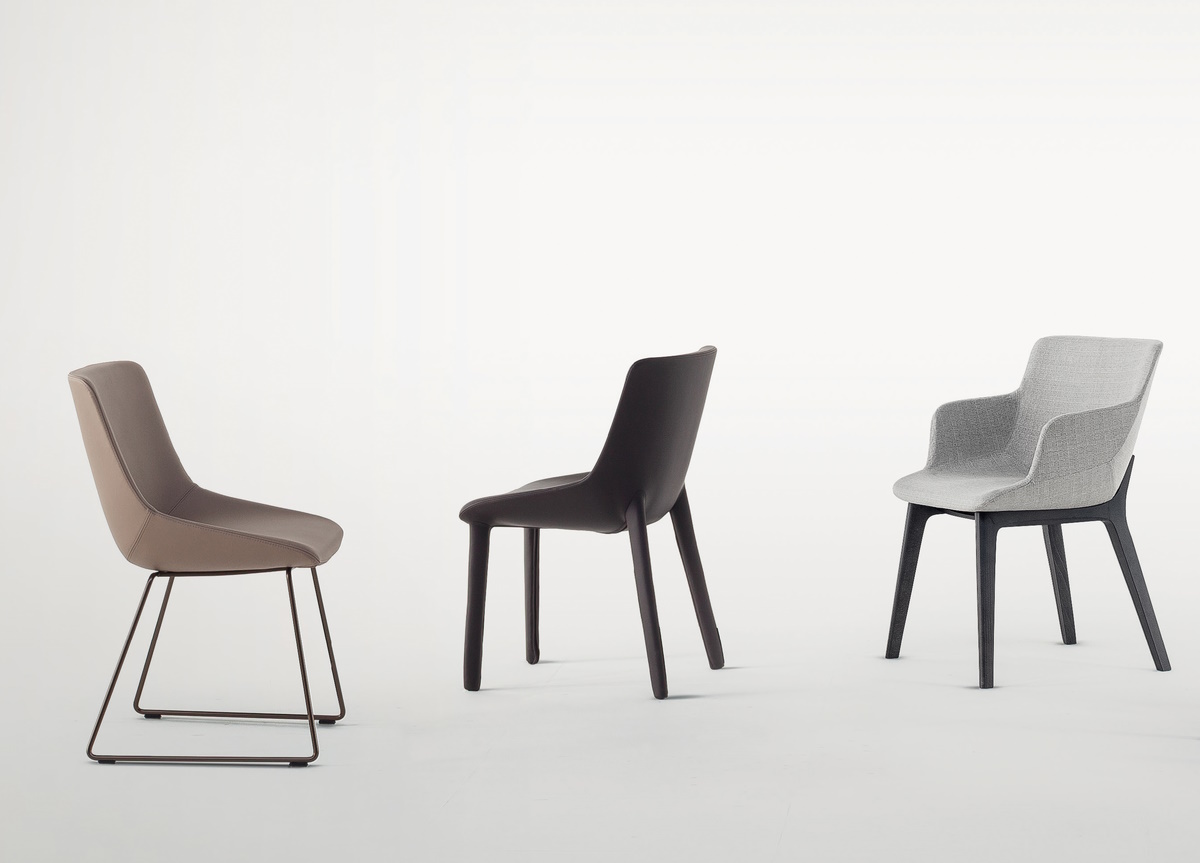 The Bonaldo Miss Artika dining chair by Gino Carollo is an extremely comfortable padded chair with supportive armrests and a sinuous, enveloping design capable of holding and embracing a person.