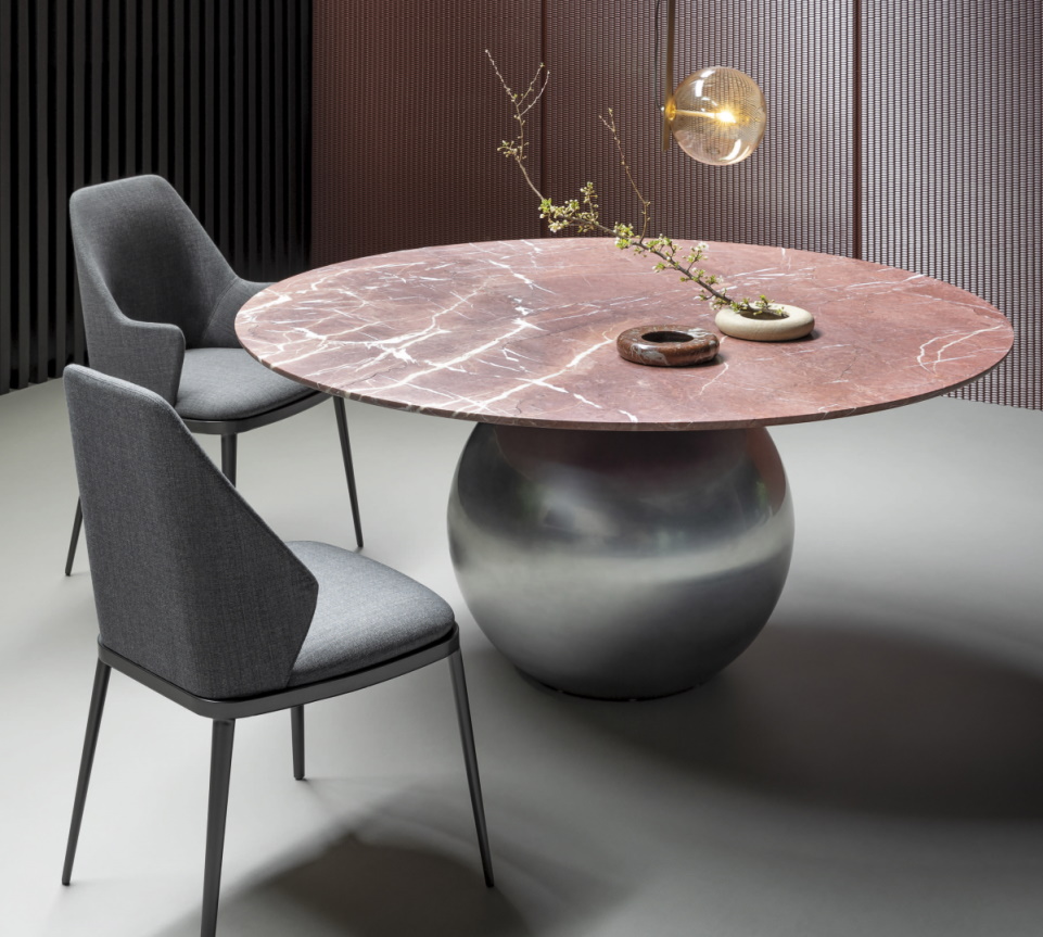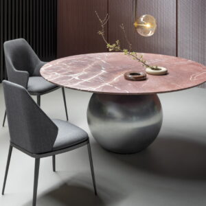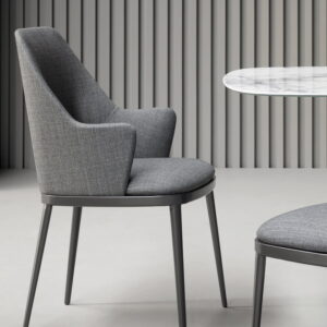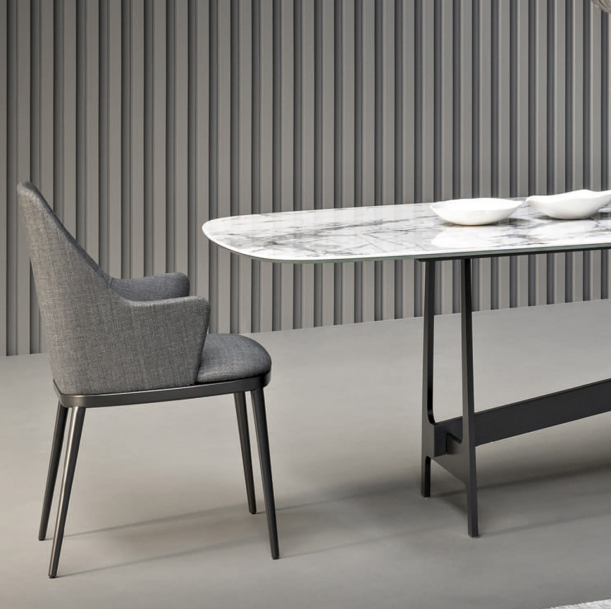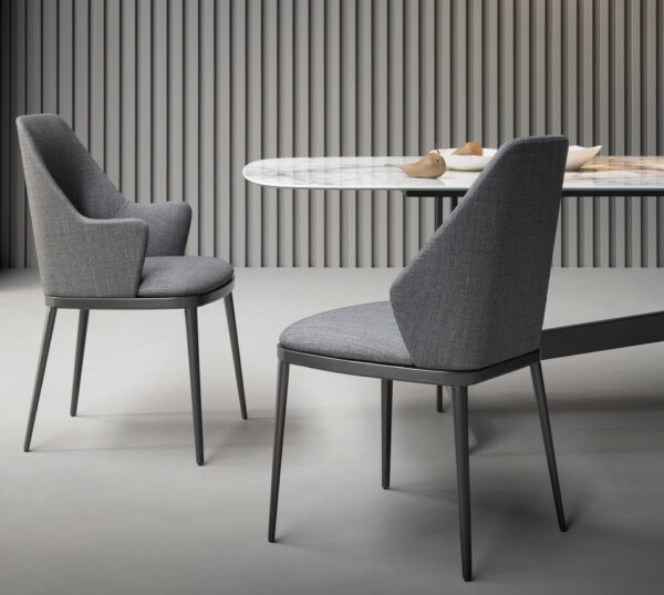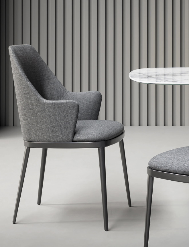 The Mida chair features a backrest with a generous, enveloping shape and metal legs in a range of finishes that give the structure a harmonious design. The soft padding of the seat and backrest, combined with the exquisite upholstery offered by Bonaldo, make Mida the ideal element to position in a living area or around a table.