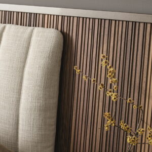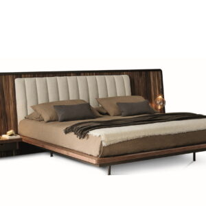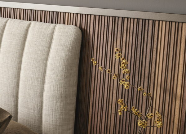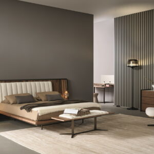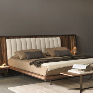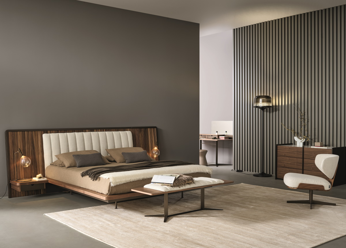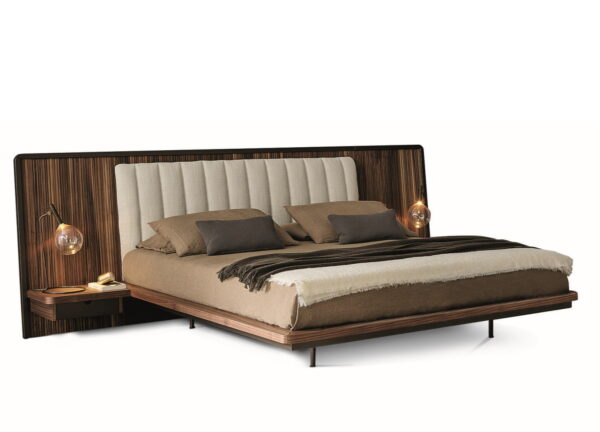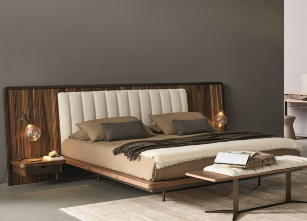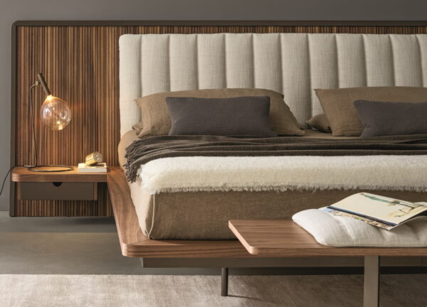 The flat, slimline bed base, also in Canaletto walnut, rests on slender bronze metal feet, which gives the bed the impression of being “suspended” as if it is floating in the bedroom. The headboard edge is in bronze matt lacquered wood to match the feet and drawer fronts.