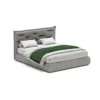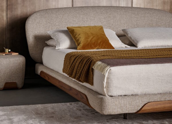 The generously padded headboard has fully removable covers which can be selected in a wide range of colours in a huge variety of fabrics and ecoleathers. The wood details and frame are in canaletto walnut whilst the small cylindrical metal feet are in a bronze finish.