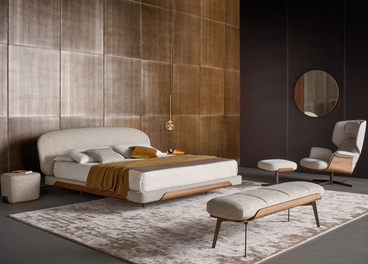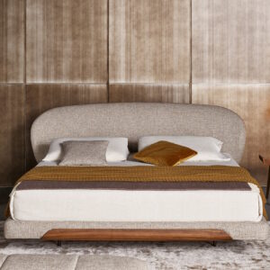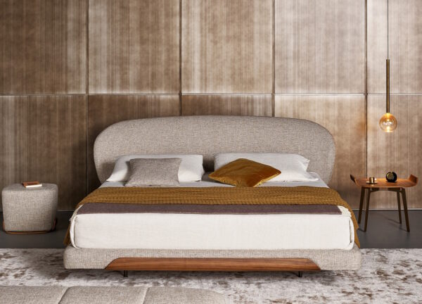The Bonaldo Olos bed by Mauro Lipparini, part of the extensive Olos collection, has an elliptical, naturally enveloping headboard and features curved wood details on the bed base, the common thread that runs through the whole collection and which hints at its Nordic inspiration.