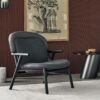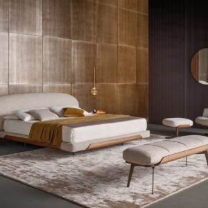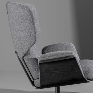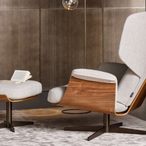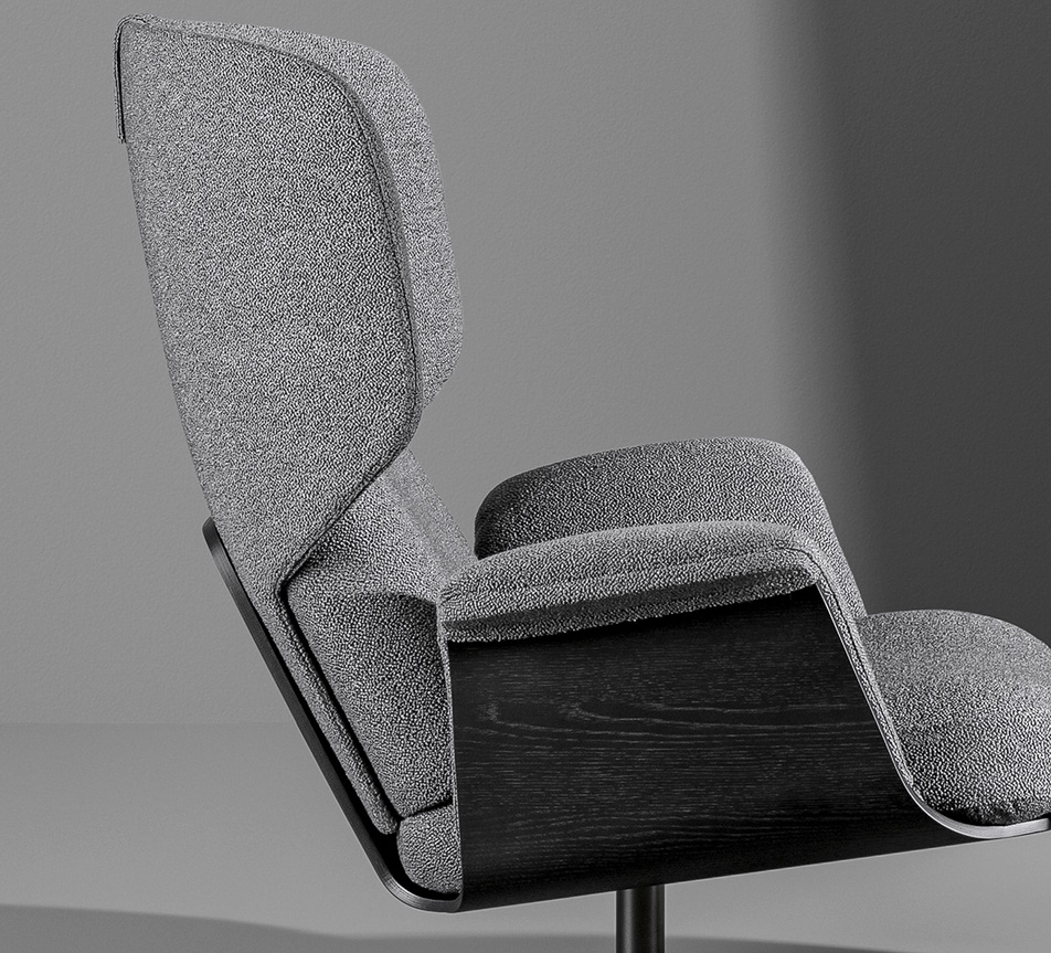 This beautiful chair is a contemporary reinterpretation of a mid-century modern design that reminds us of the authenticity of curved lamellar woodworking. Like a protective shell, the smooth gentle curves of the extremely supportive high back wooden frame combine with the sinuous roundness of the deep upholstered padding to offer generous and enticing levels of comfort.