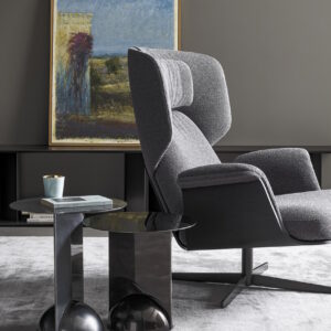 The wood frame can be selected in either canaletto walnut or coal oak. The central metal swivel base is available in several finishes, including white, black, pearl gold or lead.